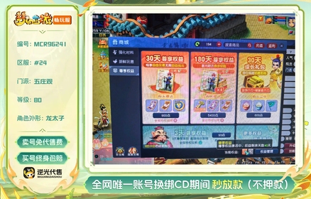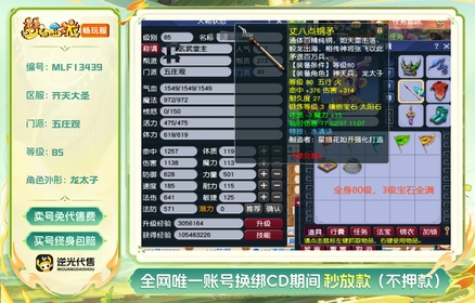 总经验:30000万 | 等级:85 | 五庄观,普陀山 | 无换绑CD | 180天尊享特权 | 【逆光代售卖号0手续费】【买号找回永久包赔】