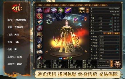 满双排5属4减,3900属,400减;神器武魂均打造好;附体潜渊+游龙+染色;装备基本小完美。上号就玩。英雄帖满图鉴拉满。转盘赚得多。整体价值远大于充值金额。永久坐骑时装。出之前一直箱子拉满。开区到现在天天周周拉满的。