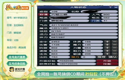 总经验:190万 | 等级:109 | 狮驼岭 | 无换绑CD | 超级绿通 | 男 | 【逆光代售卖号0手续费】【买号找回永久包赔】