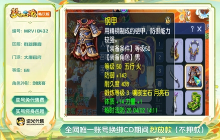 总经验:12000万 | 等级:69 | 大唐官府 | 无换绑CD | 180天尊享特权 | 男 | 【逆光代售卖号0手续费】【买号找回永久包赔】