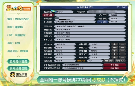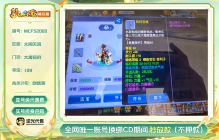 总经验:160000万 | 等级:109 | 大唐官府 | 无换绑CD | 180天尊享特权 | 男 | 【逆光代售卖号0手续费】【买号找回永久包赔】