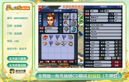 总经验:60000万 | 等级:105 | 五庄观,普陀山 | 无换绑CD | 180天尊享特权 | 男 | 【逆光代售卖号0手续费】【买号找回永久包赔】