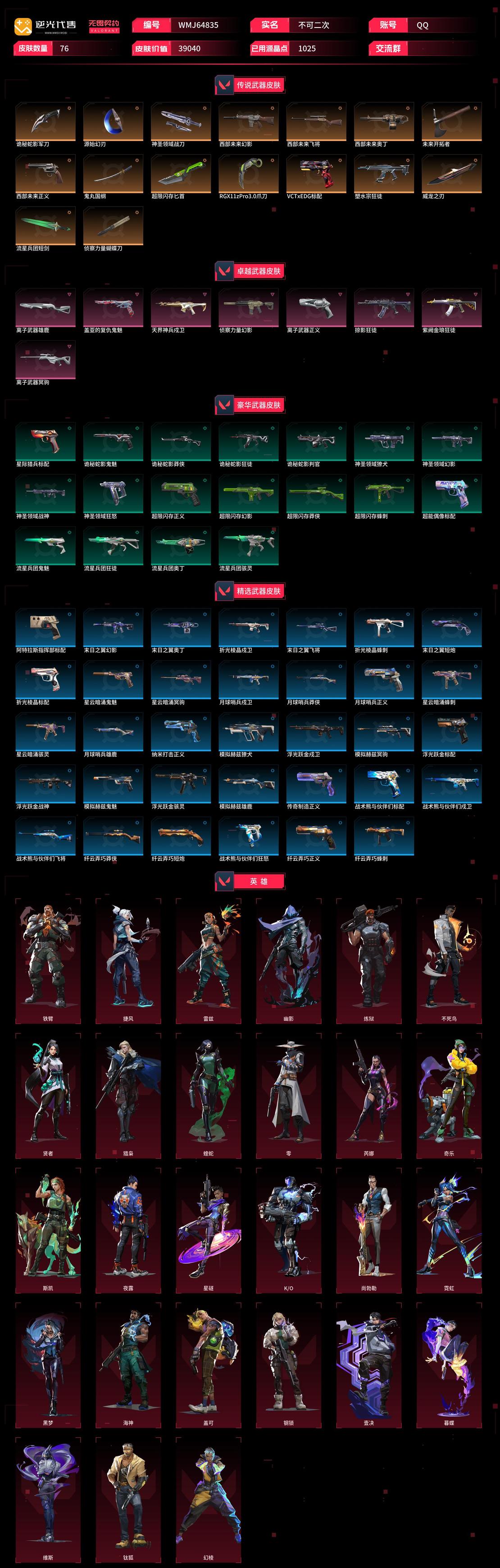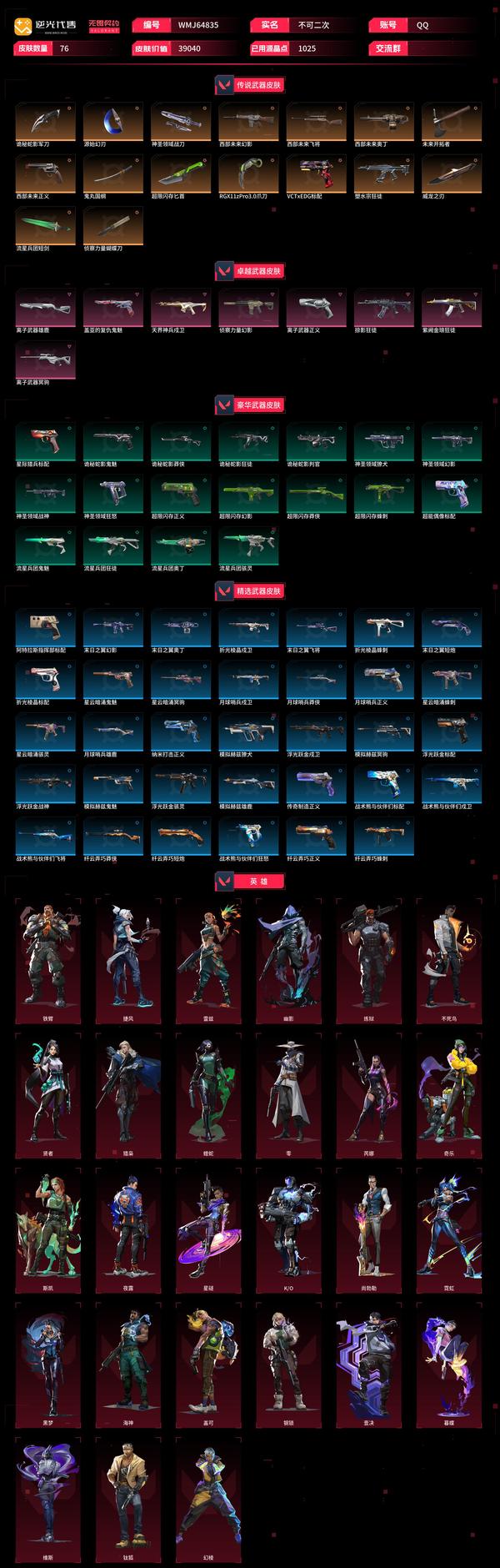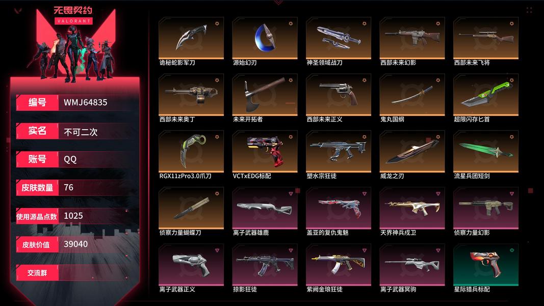 【WMJ64835】 | 卓越武器数量:8 | 传奇武器数量:16 | 终极武器数量:0 | 皮肤资产价值:39040 | 西部未来奥丁 | 鬼丸国纲、侦察力量蝴蝶刀、RGX11zPro3.0爪刀、超限闪存匕首、未来开拓者、诡秘蛇影军刀、神圣领域战刀、流星兵团短剑、威龙之刃、源始幻刃 | 天界神兵戍卫 | 离子武器雄鹿 | 盖亚的复仇鬼魅 | 西部未来飞将 | 西部未来正义、离子武器正义 | 离子武器冥驹 | 侦察力量幻影、西部未来幻影 | 紫阙金琅狂徒、塑水宗狂徒、掠影狂徒