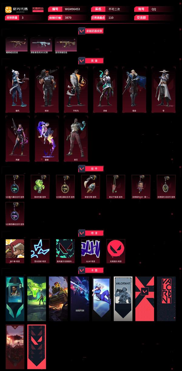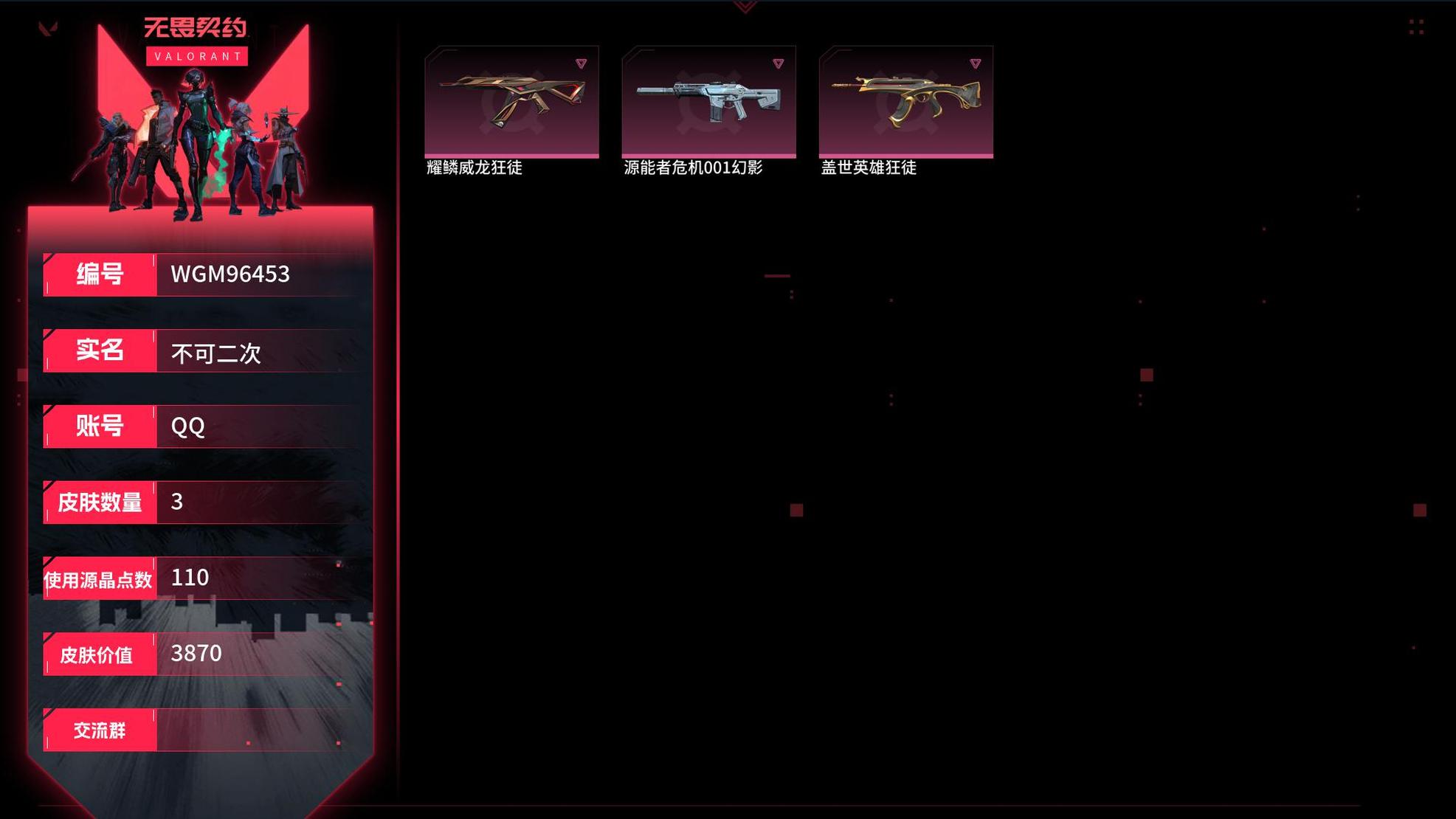 【WGM96453】 | 终极武器数量:0 | 皮肤资产价值:3870 | 卓越武器数量:3 | 传奇武器数量:0 | 可二次实名 | 源能者危机001幻影 | 盖世英雄狂徒、耀鳞威龙狂徒