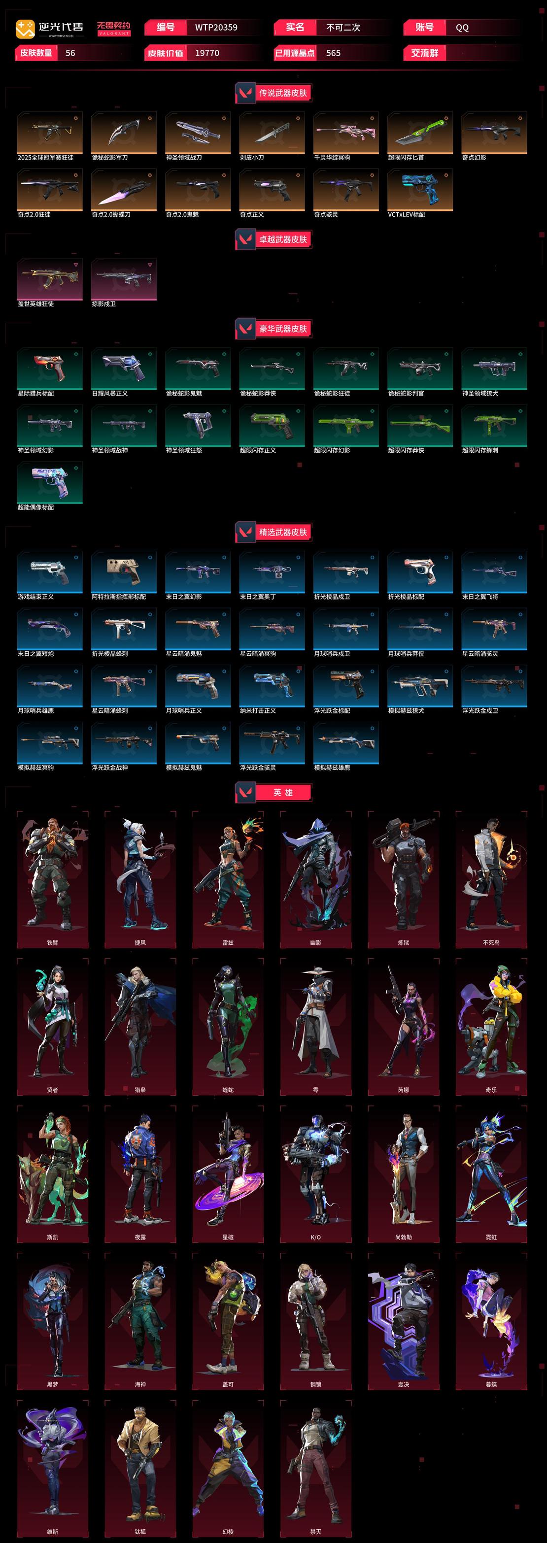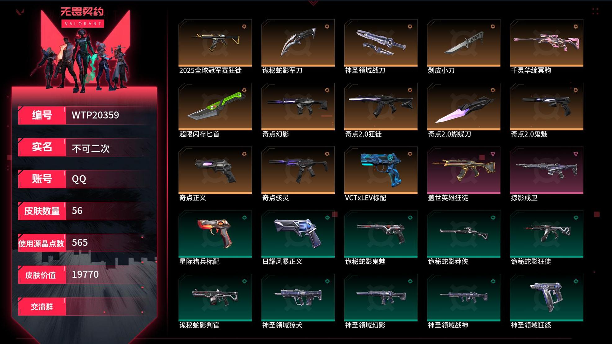 【WTP20359】 | 终极武器数量:0 | 皮肤资产价值:19770 | 卓越武器数量:2 | 传奇武器数量:13 | 奇点正义 | 千灵华绽冥驹 | 超限闪存匕首、诡秘蛇影军刀、神圣领域战刀、剥皮小刀、奇点2.0蝴蝶刀 | 掠影戍卫 | 奇点幻影 | 奇点骇灵 | 奇点2.0鬼魅 | 2025全球冠军赛狂徒、奇点2.0狂徒、盖世英雄狂徒