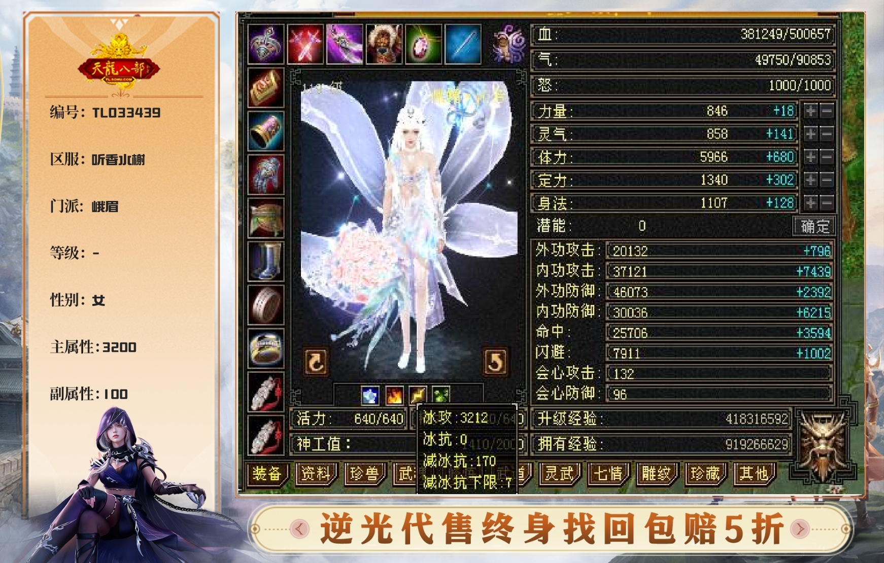 【TLO33439】 | 主属性:3200 | 等级:119 | 副属性:100 | 50万血1100火炕时装多带永久麒麟 | 畅游账号 | 峨眉 | 女 | 主冰攻 | VIP3