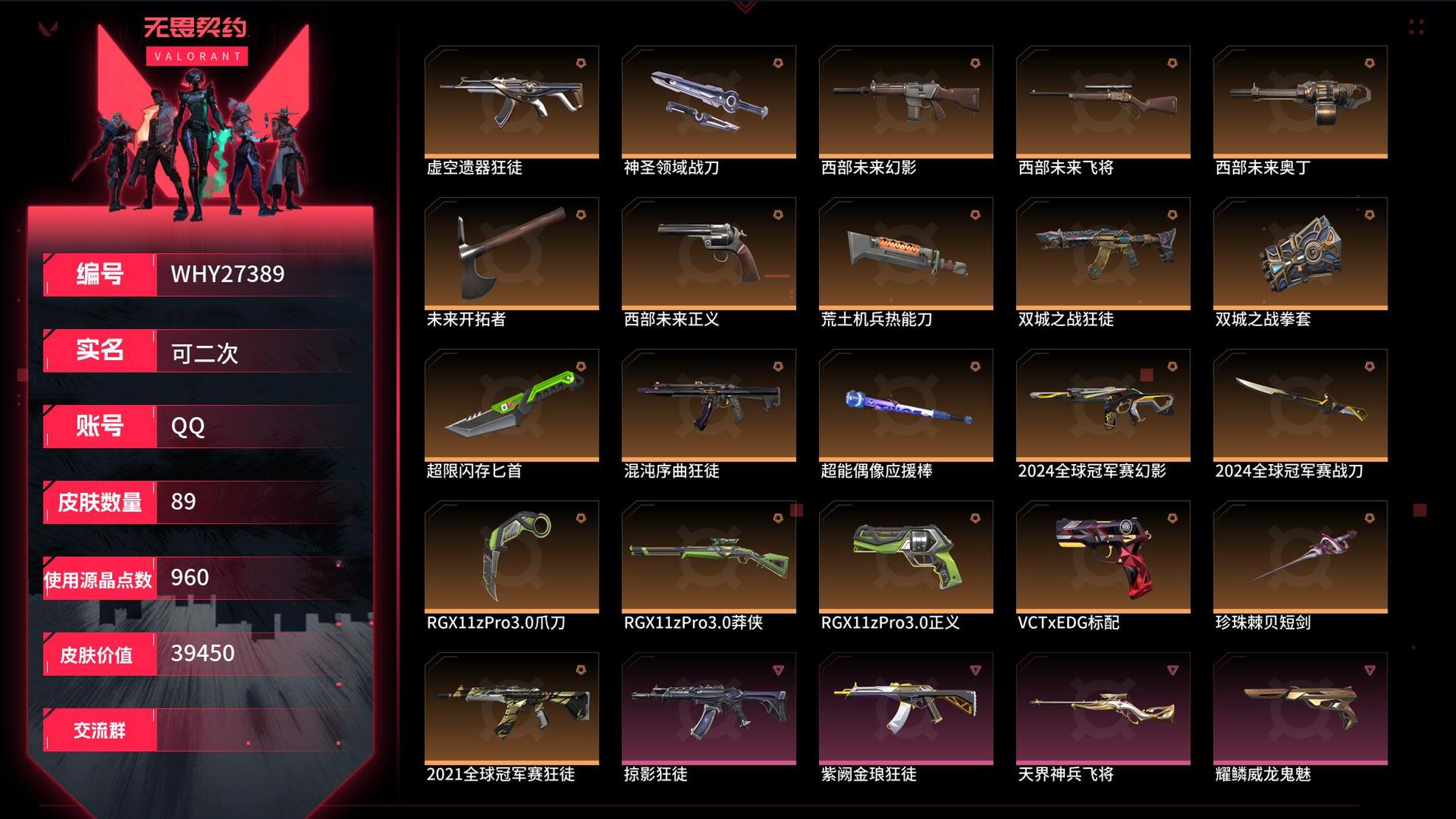 【QQ账号 不可二次 可排位 已用无畏点数:39450 已用源晶点数:960 2024全球冠军赛套装,双城之战,西部未来 珍珠棘贝-短剑,RGX-11z-Pro//3.0-爪刀,2024全球冠军赛-战刀,双城之战-拳套,未来开拓者 双城之战-狂徒,2021全球冠军赛-狂徒,混沌序曲-狂徒,掠影-狂徒,紫阙金琅-狂徒,虚空遗器-狂徒 2024全球冠军赛-幻影,西部未来-幻影 RGX-11z-Pro//3.0-正义,西部未来-正义 耀鳞威龙-鬼魅 VCT-x-EDG-标配 天界神兵-飞将,西部未来-飞将 堕天遗武-冥驹 深海水族-莽侠,RGX-11z-Pro//3.0-莽侠 西部未来-奥丁 复古浪