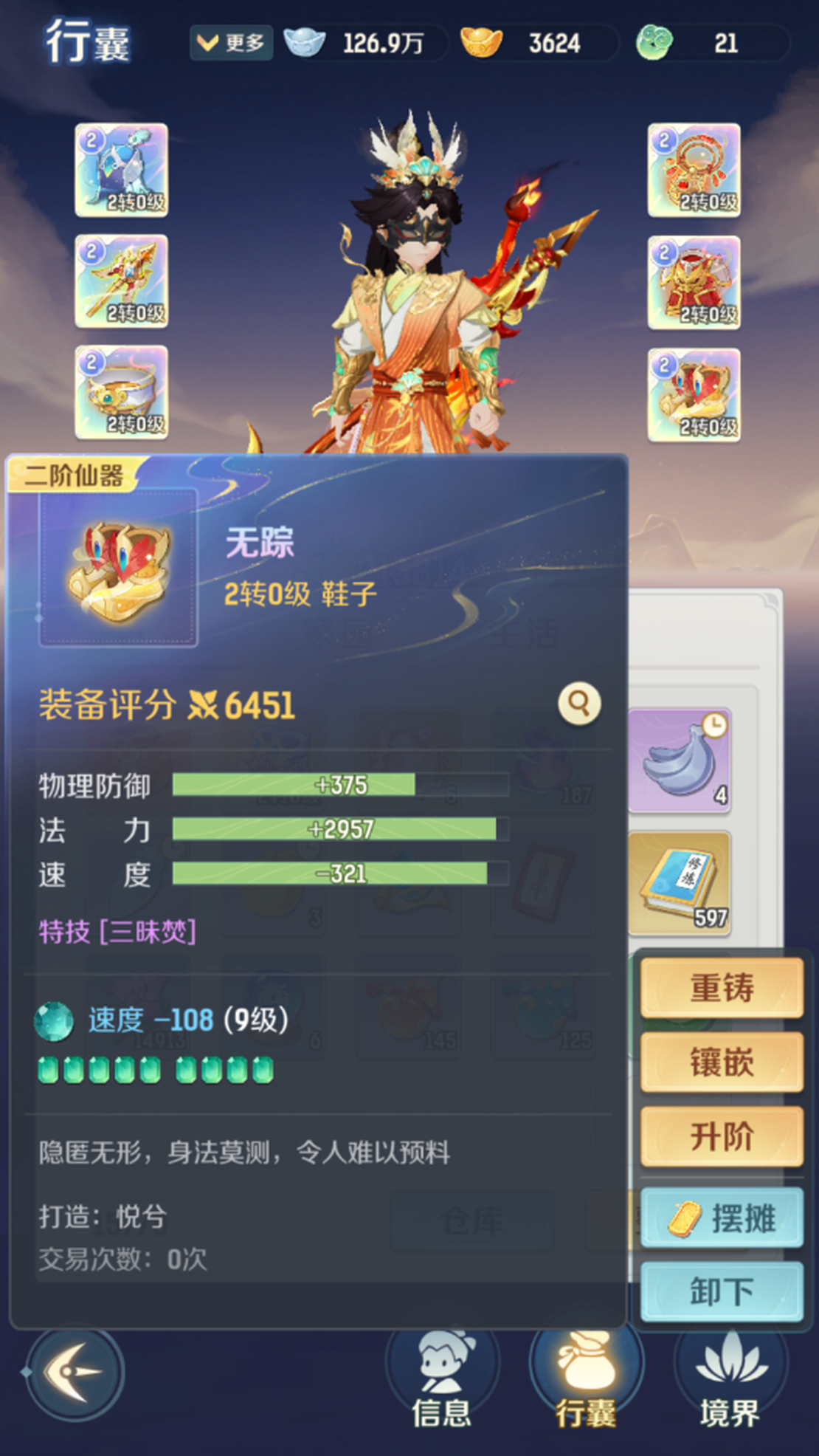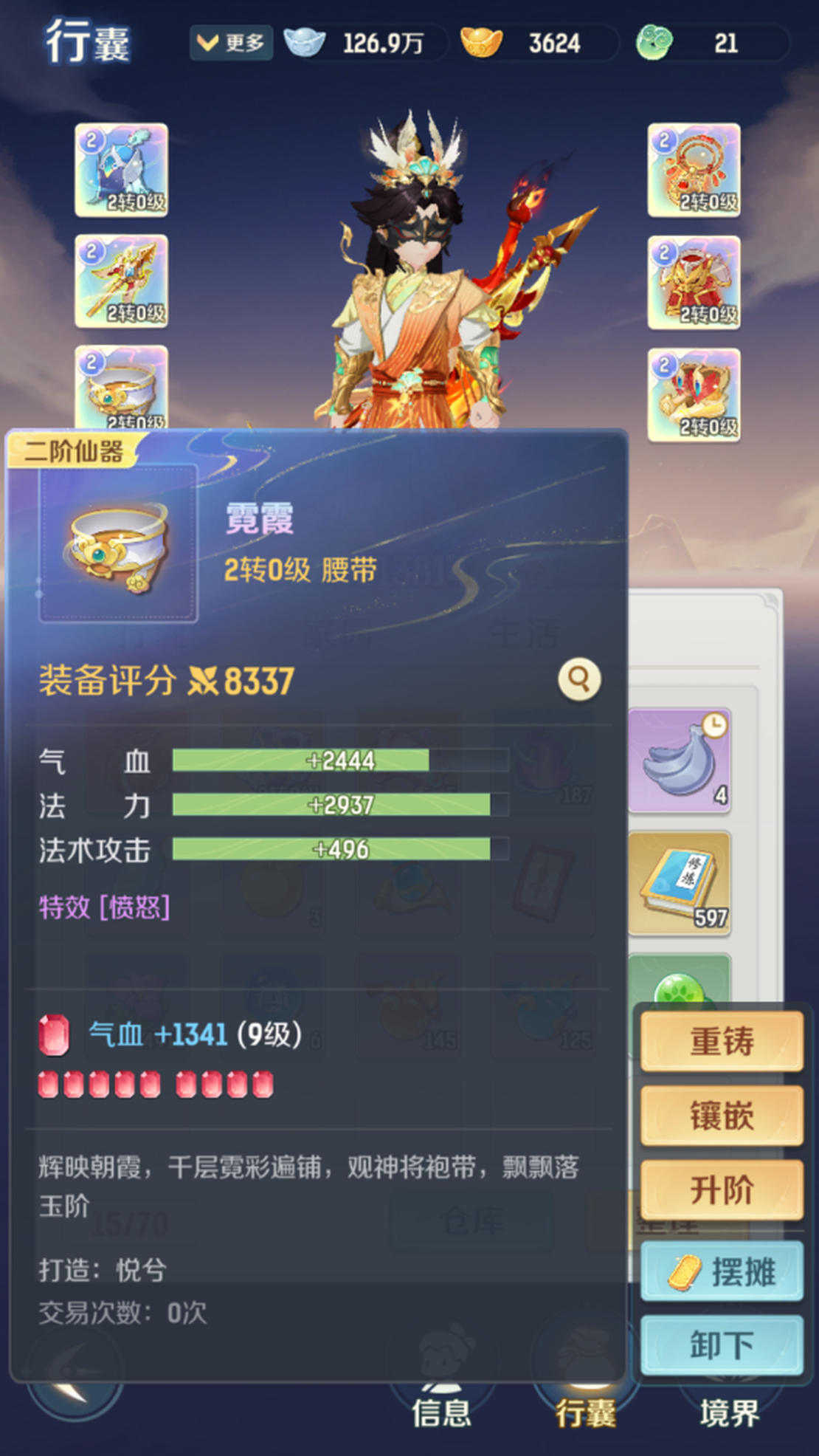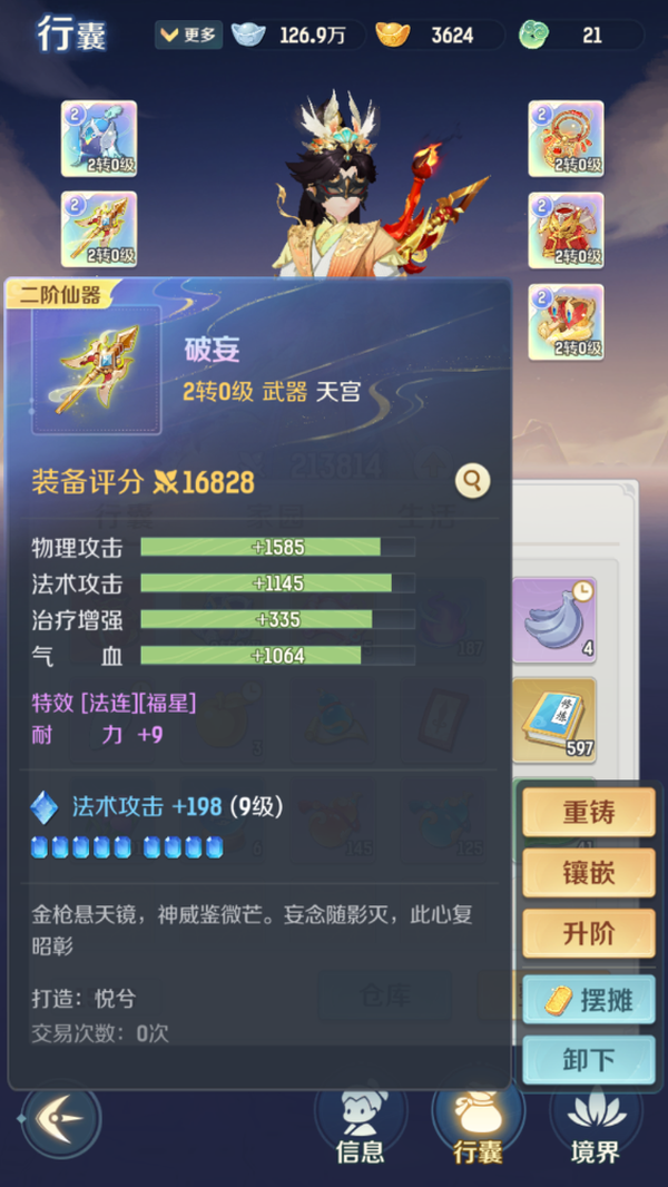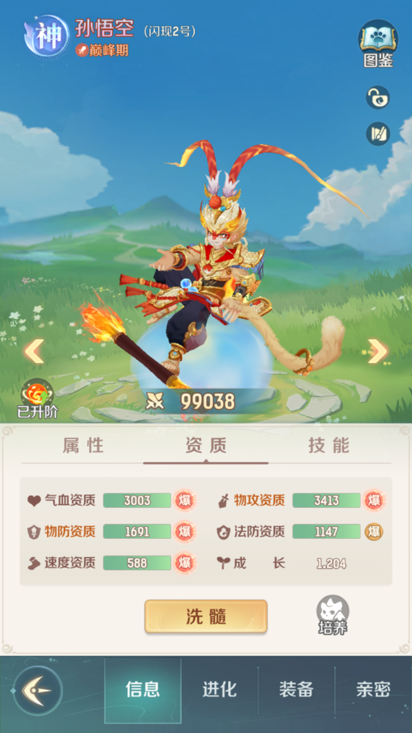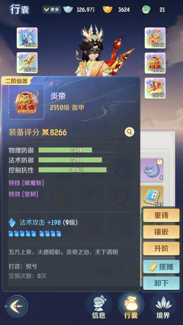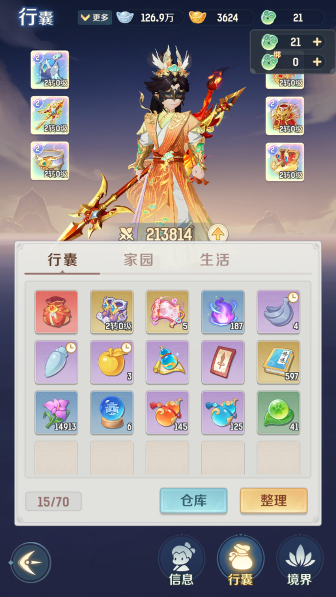 【LCB06207】 | 神兽数量:3 | 角色评分:213814 | 仙器:7 | 珍兽数量:2 | 等级:126 | 天宫 | 男 | 精卫、画中仙、孙悟空 | 龙马、貔貅