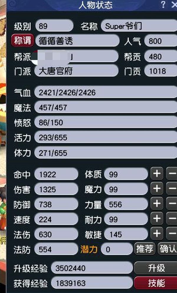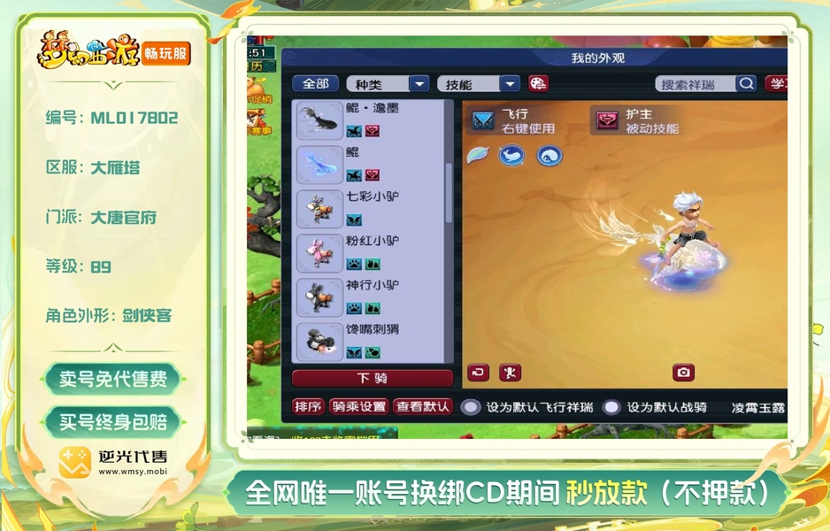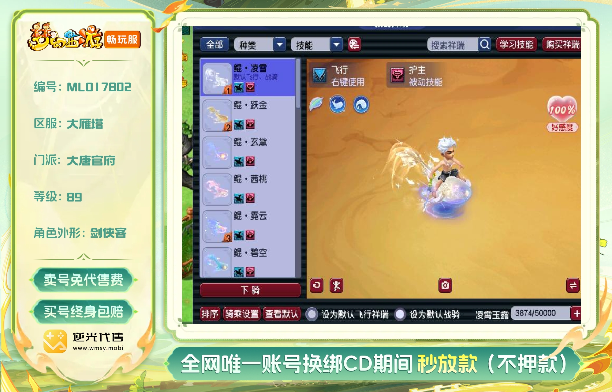 89成品大唐官府人物三修13满,宠物法术修炼13,紫气顶级豪宅,顶级外观,限量版锦衣,染色光膀子浮生绡,限量祥瑞鲲所有鲲都有,8只鲲好感度全满,每天最高免死8次!
