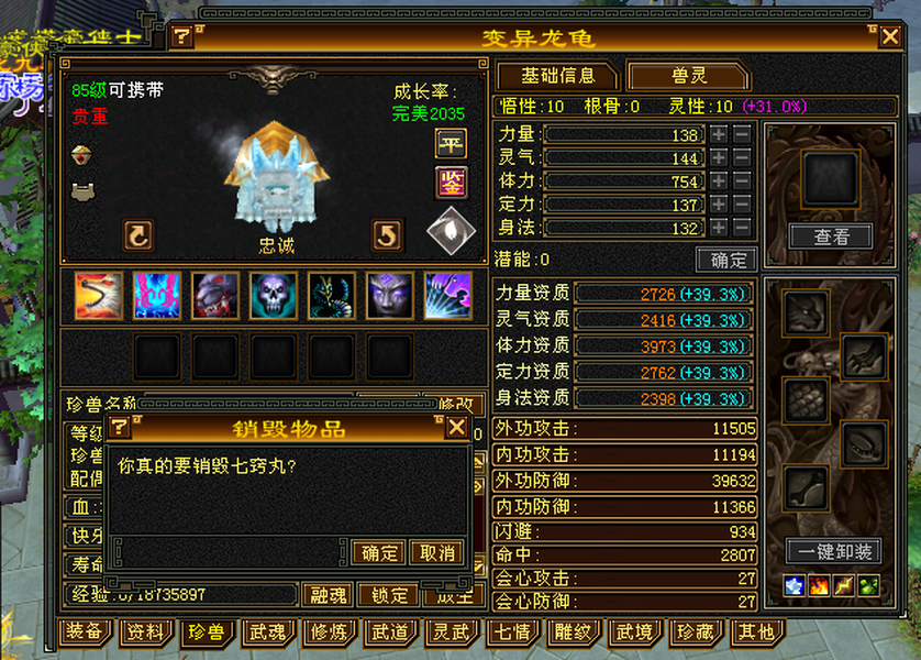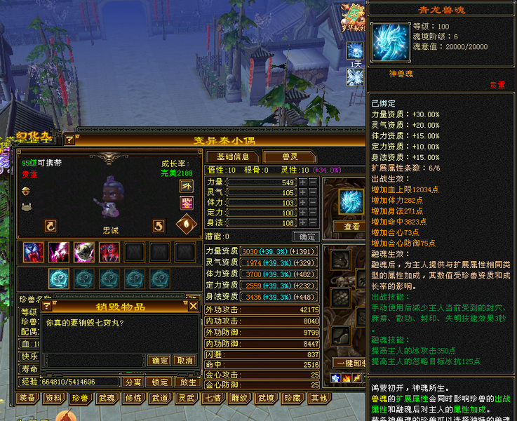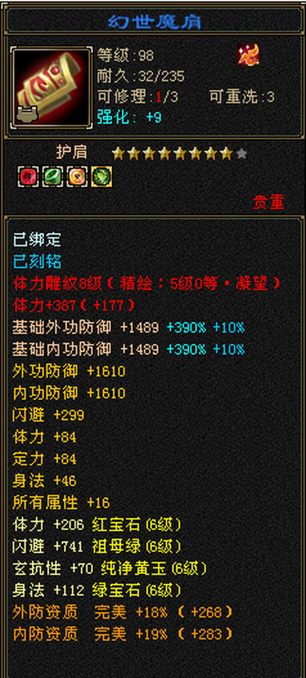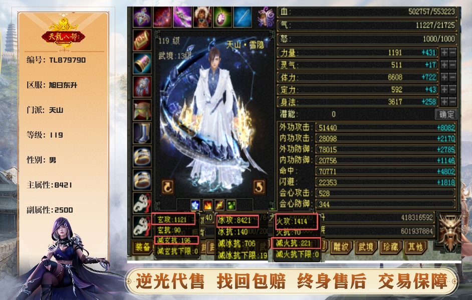 7属6神三修天山极品灵武无敌丹,高杂减,切减抗套1100+ 伤害2.2 9 10雕文 有内功武魂可转武当且杂减高 买号可电话沟通