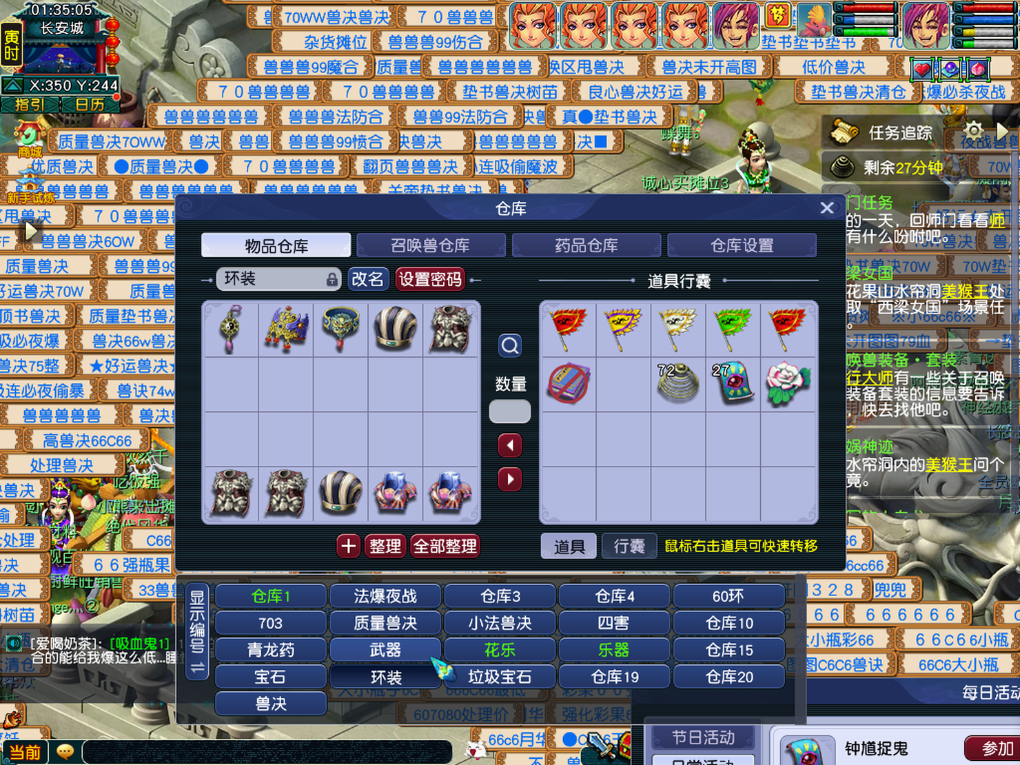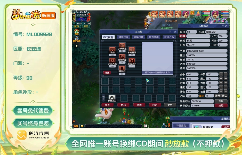 捡漏来,没时间玩了便宜出1hs4ps,hs开了2丹,盘丝1丹等级分别hs90ps91929395天阵带飞行坐骑,人环有一个ps号66环,ps4个号差一个号腰带没开孔(头开了),其它3个都是双三孔,宝宝系统血凤凰,号上带800多万现金,五个号副本积分都1000,仓库有些环没清,