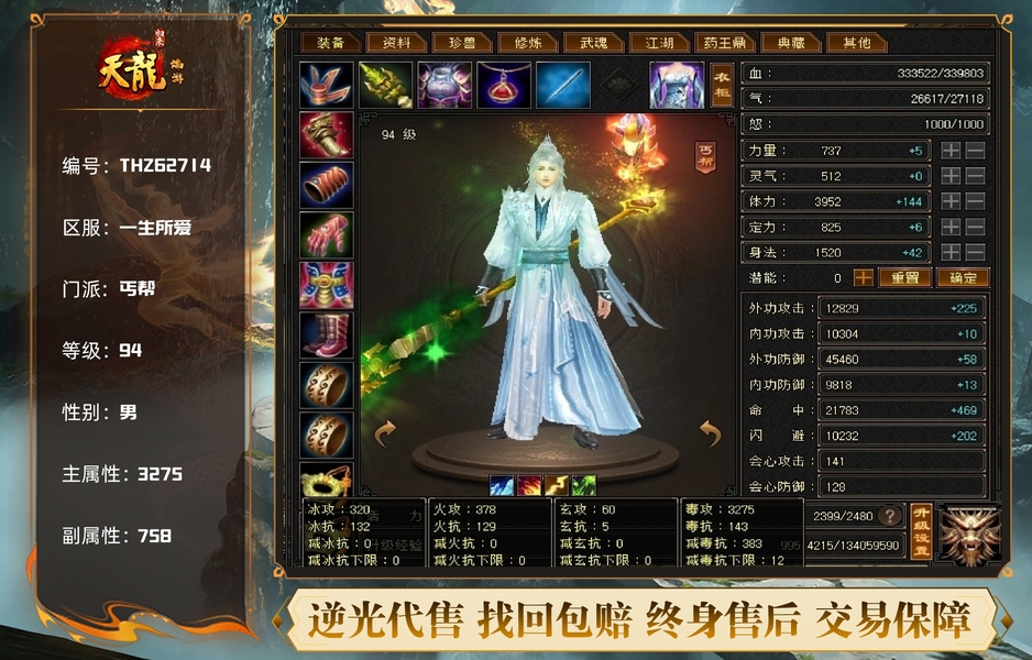 【THZ62714】 | 主属性:3275 | 等级:94 | 副属性:758 | 男 | 丐帮 | 主毒攻 【逆光终身包赔五折】