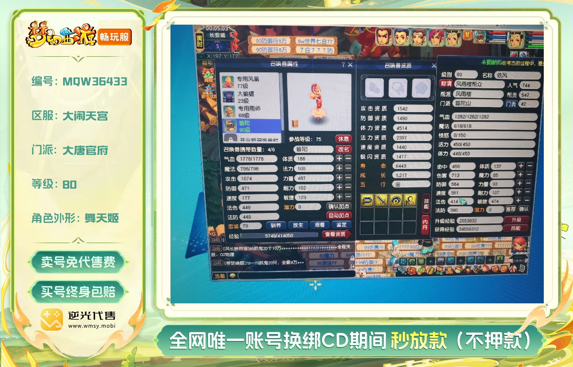 【MQW36433】 | 等级:80 | 180天尊享特权 | 五庄观、化生寺、方寸山、普陀山、大唐官府 | 地载阵、雷绝阵【逆光代售卖号0手续费】【买号找回永久包赔】