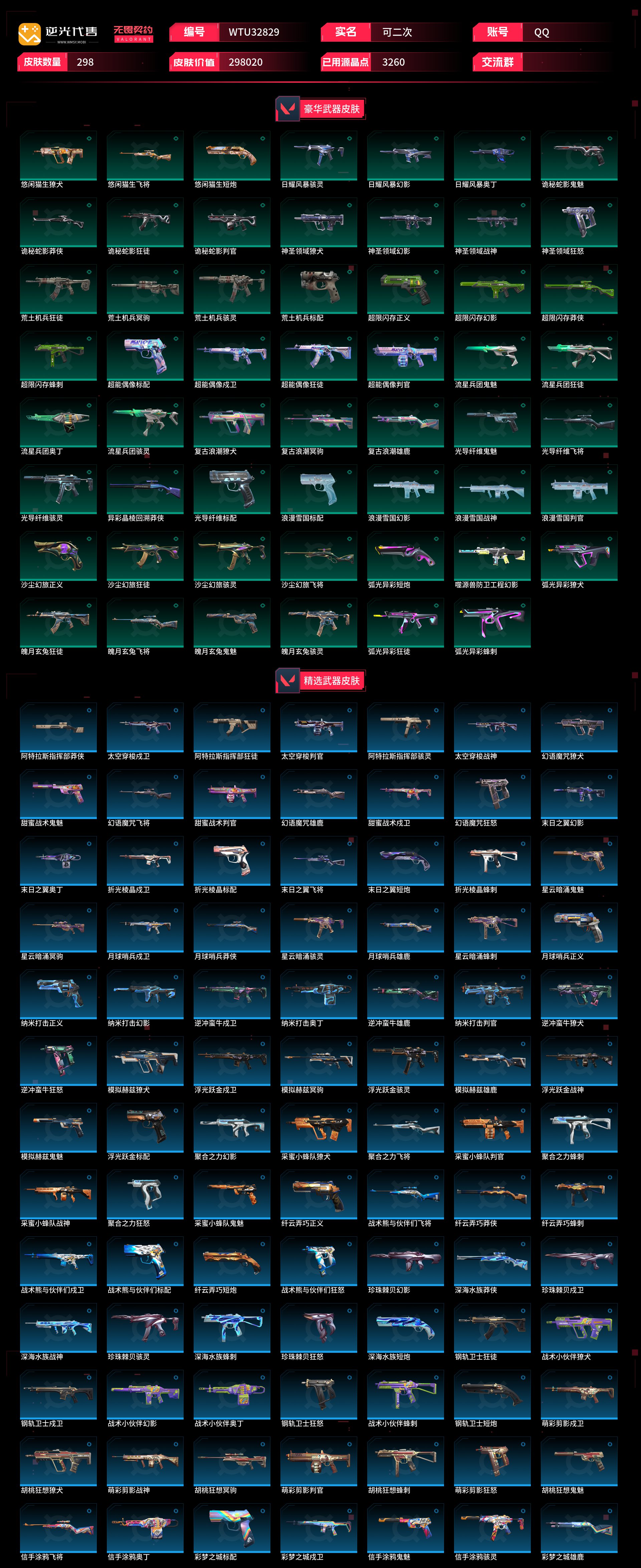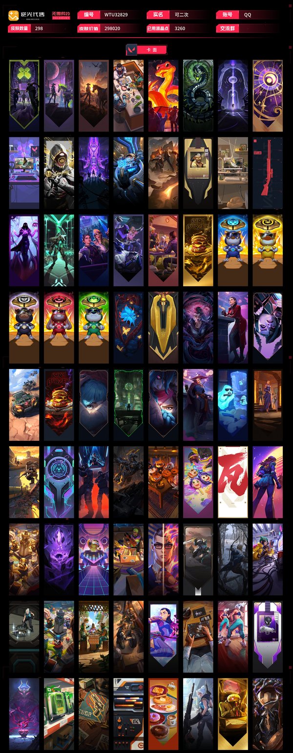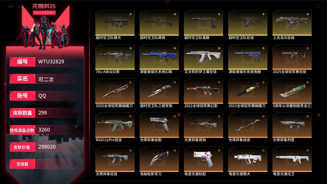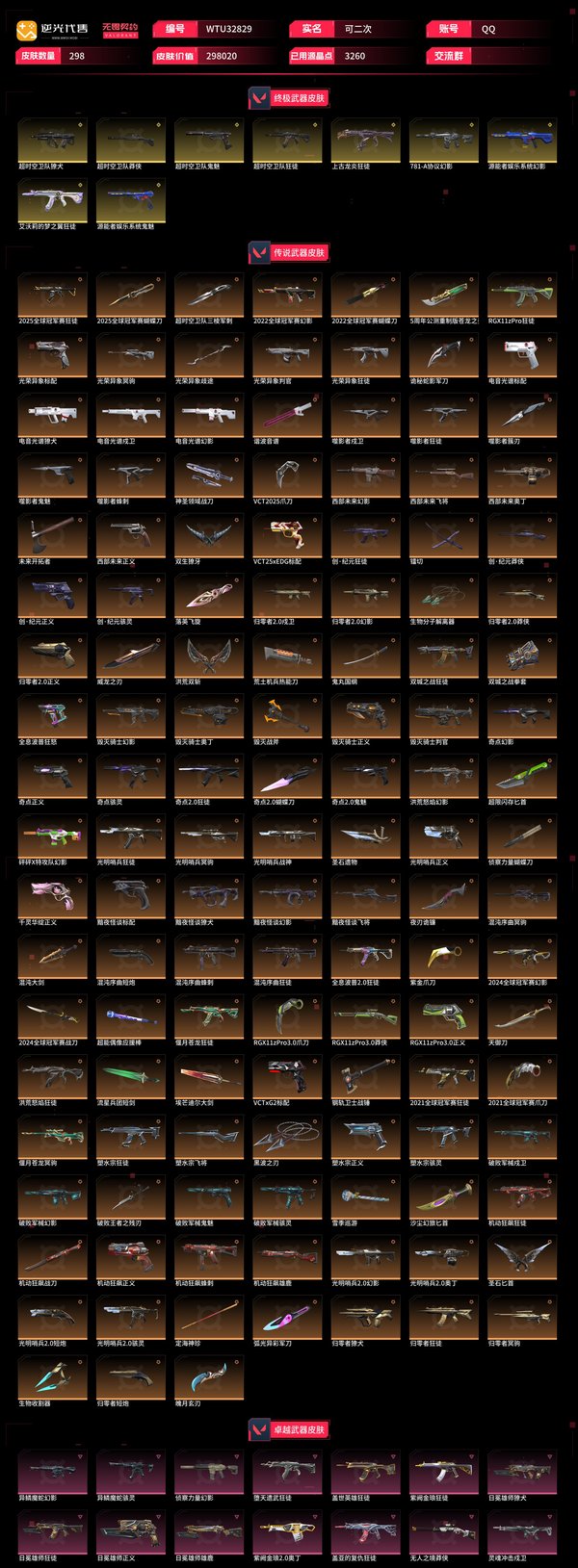 【WTU32829】 | 卓越武器数量:14 | 传奇武器数量:129 | 终极武器数量:9 | 皮肤资产价值:298020 | 光明哨兵2.0奥丁、毁灭骑士奥丁、西部未来奥丁、紫阙金琅2.0奥丁 | 全息波普狂怒 | 定海神珍、未来开拓者、超限闪存匕首、光荣异象歧途、紫金爪刀、奇点2.0蝴蝶刀、埃芒迪尔大剑、雪季巡游、双城之战拳套、2022全球冠军赛蝴蝶刀、VCT2025爪刀、侦察力量蝴蝶刀、鬼丸国纲、夜刃诡镰、双生獠牙、圣石遗物、沙尘幻旅匕首、洪荒双斩、2021全球冠军赛爪刀、噬影者簇刃、威龙之刃、流星兵团短剑、落英飞旋、黑波之刃、破败王者之残刃、混沌大剑、诡秘蛇影军刀、2024全球冠军赛战刀、谐波音谱、神圣领域战刀、魄月玄刃、镭切、超能偶像应援棒、弧光异彩军刀、生物分子解离器、5周年公测重制版苍龙之刃、超时空卫队三棱军刺、机动狂飙战刀、RGX11zPro3.0爪刀、2025全球冠军赛蝴蝶刀、天御刀、荒土机兵热能刀、毁灭战斧、圣石匕首、生物收割器、钢轨卫士战锤 | 归零者2.0戍卫、灵魂冲击戍卫、噬影者戍卫、电音光谱戍卫、破败军械戍卫 | 机动狂飙雄鹿、日冕雄师雄鹿 | 光荣异象判官、毁灭骑士判官 | 噬影者蜂刺、混沌序曲蜂刺、机动狂飙蜂刺 | 光明哨兵战神 | 噬影者鬼魅、奇点2.0鬼魅、破败军械鬼魅、源能者娱乐系统鬼魅、超时空卫队鬼魅 | 西部未来飞将、黯夜怪谈飞将、塑水宗飞将 | 奇点正义、创·纪元正义、西部未来正义、塑水宗正义、毁灭骑士正义、千灵华绽正义、机动狂飙正义、RGX11zPro3.0正义、日冕雄师正义、归零者2.0正义、光明哨兵正义 | 光荣异象冥驹、归零者冥驹、光明哨兵冥驹、偃月苍龙冥驹、混沌序曲冥驹 | 奇点幻影、电音光谱幻影、781-A协议幻影、光明哨兵2.0幻影、源能者娱乐系统幻影、西部未来幻影、洪荒怒焰幻影、黯夜怪谈幻影、2022全球冠军赛幻影、破败军械幻影、2024全球冠军赛幻影、侦察力量幻影、砰砰X特攻队幻影、毁灭骑士幻影、异鳞魔蛇幻影、归零者2.0幻影 | 光明哨兵2.0短炮、归零者短炮、混沌序曲短炮 | 黯夜怪谈獠犬、归零者獠犬、日冕雄师獠犬、电音光谱獠犬、超时空卫队獠犬 | 破败军械骇灵、创·纪元骇灵、光明哨兵2.0骇灵、塑水宗骇灵、异鳞魔蛇骇灵、奇点骇灵 | RGX11zPro3.0莽侠、创·纪元莽侠、超时空卫队莽侠、无人之境莽侠、归零者2.0莽侠 | 上古龙炎狂徒、洪荒怒焰狂徒、紫阙金琅狂徒、2025全球冠军赛狂徒、偃月苍龙狂徒、光荣异象狂徒、堕天遗武狂徒、机动狂飙狂徒、盖世英雄狂徒、混沌序曲狂徒、艾沃莉的梦之翼狂徒、RGX11zPro狂徒、盖亚的复仇狂徒、光明哨兵狂徒、2021全球冠军赛狂徒、噬影者狂徒、全息波普2.0狂徒、塑水宗狂徒、归零者狂徒、超时空卫队狂徒、日冕雄师狂徒、奇点2.0狂徒、双城之战狂徒、创·纪元狂徒【买号找回永久包赔】