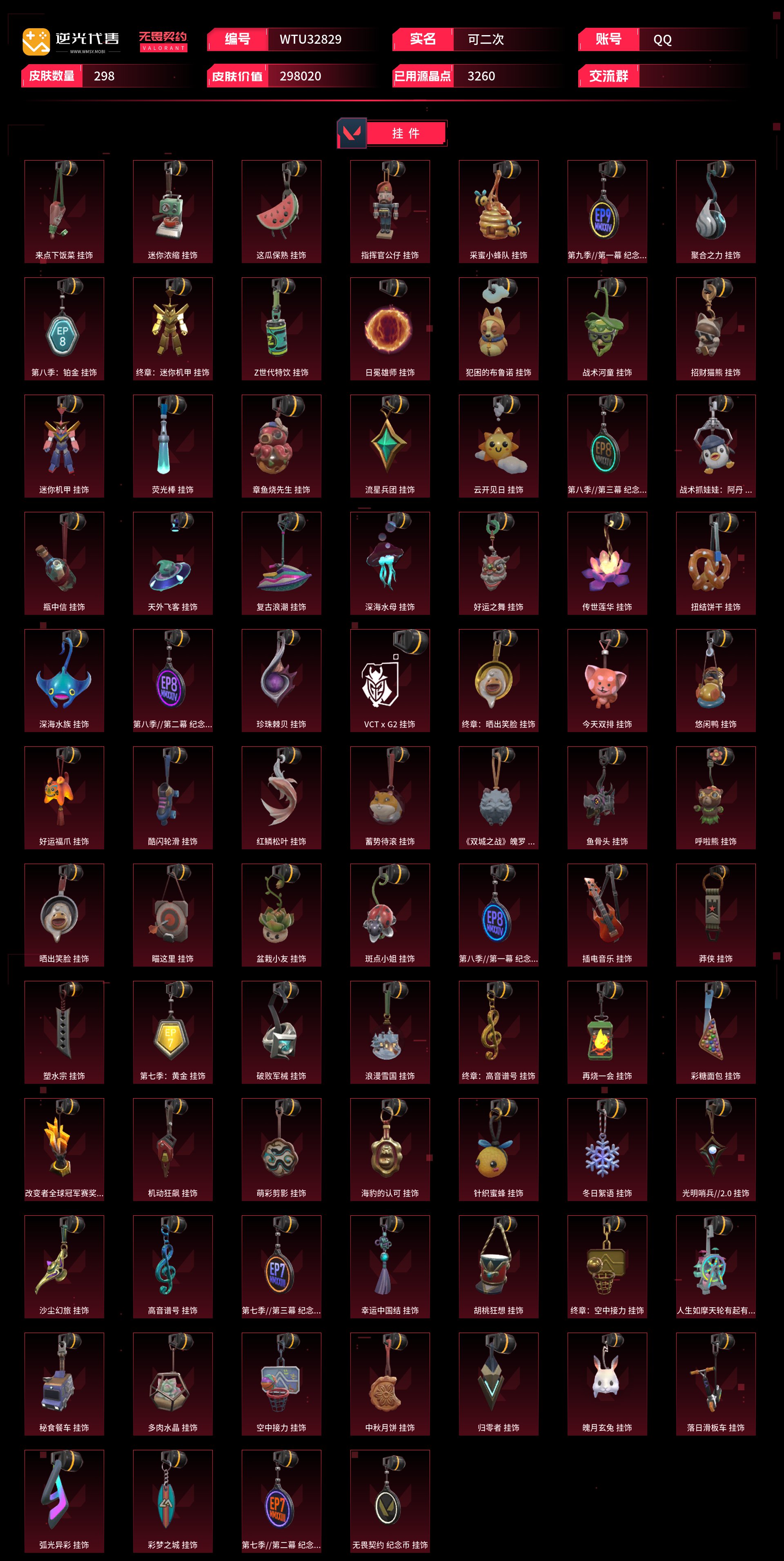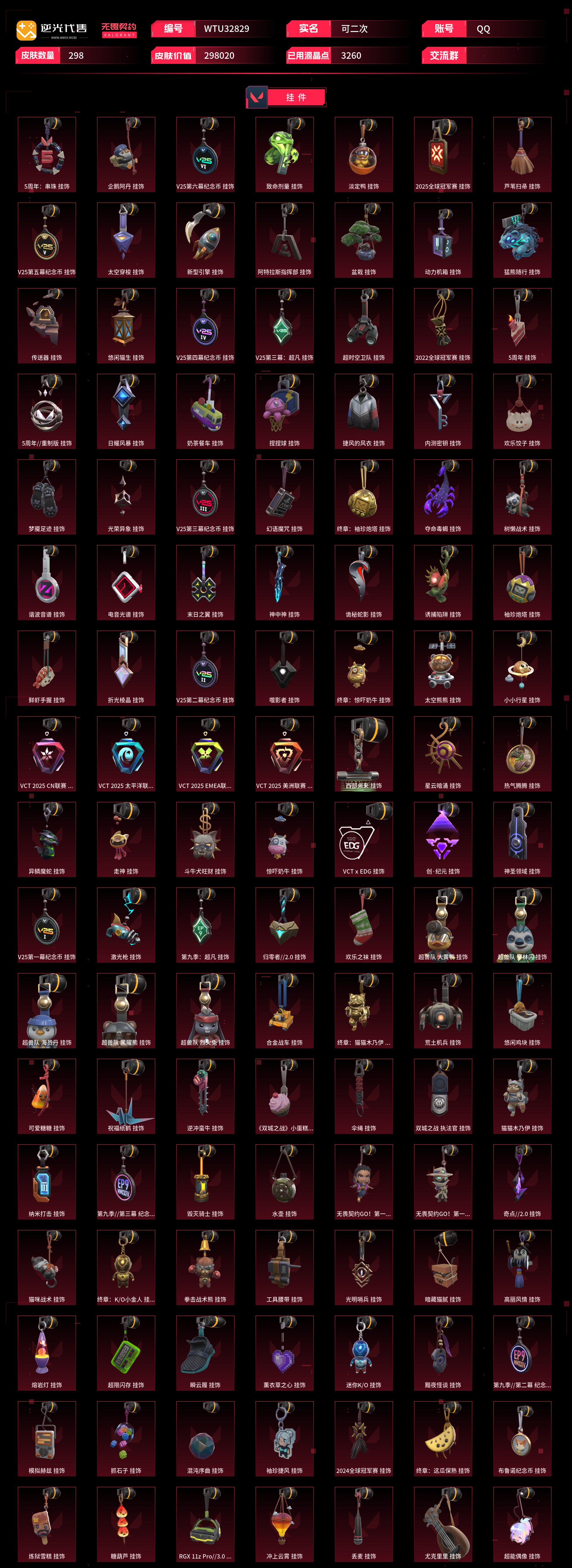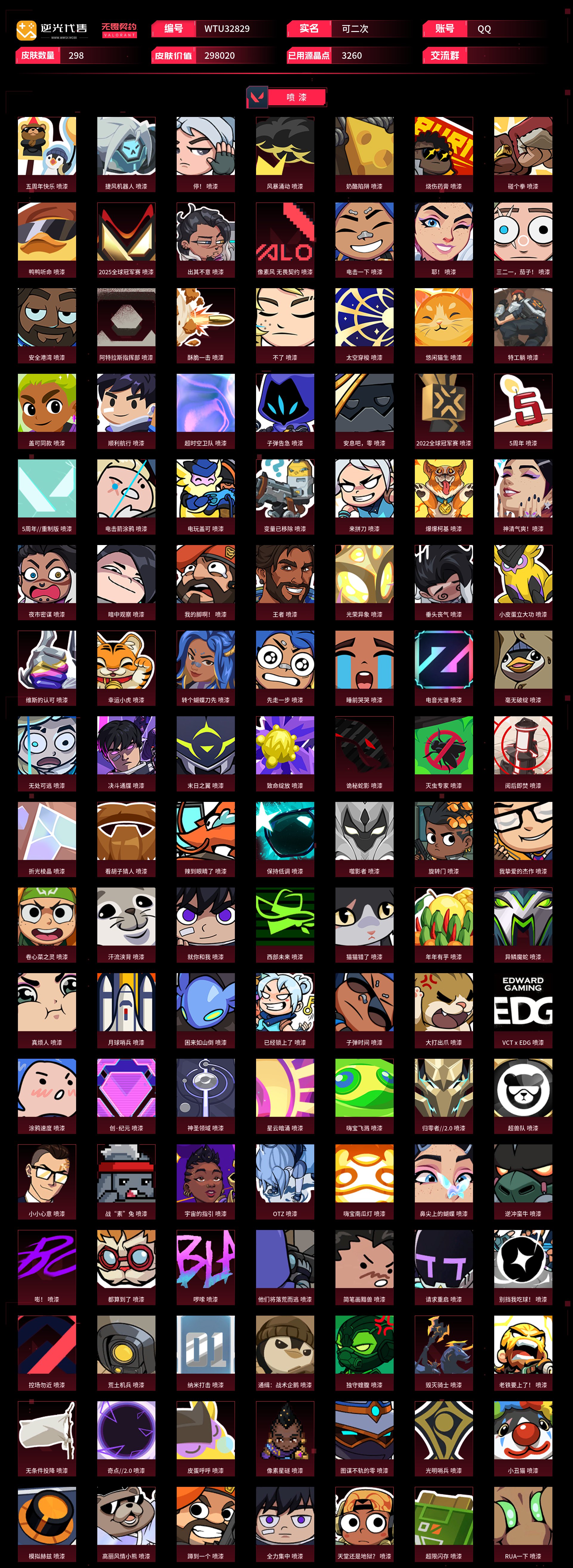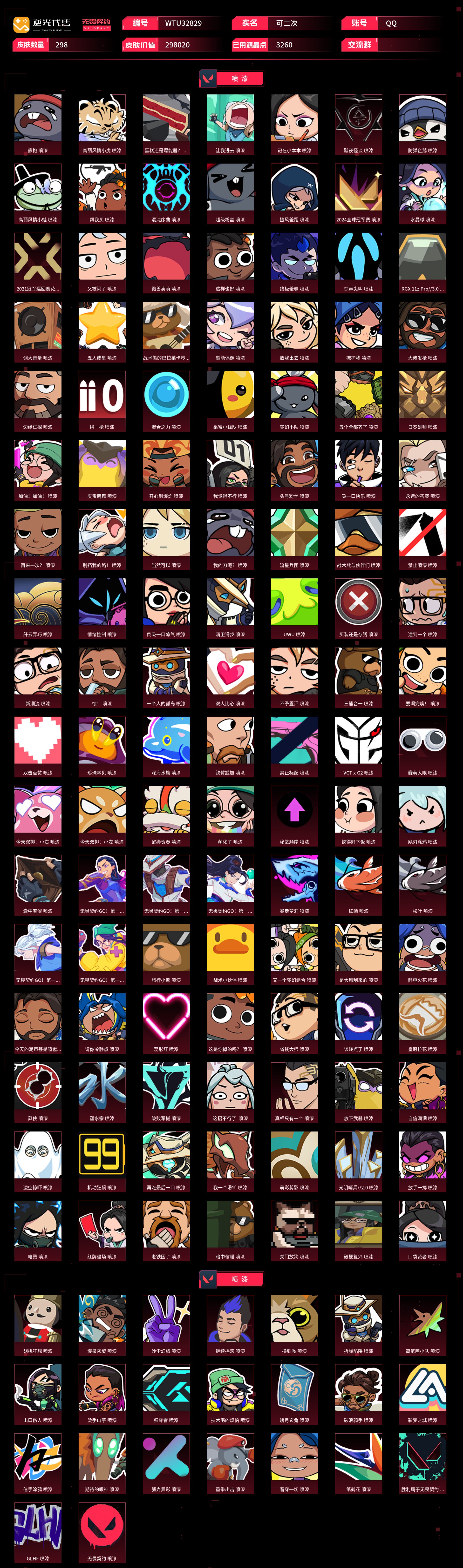 【WTU32829】 | 卓越武器数量:14 | 传奇武器数量:129 | 终极武器数量:9 | 皮肤资产价值:298020 | 光明哨兵2.0奥丁、毁灭骑士奥丁、西部未来奥丁、紫阙金琅2.0奥丁 | 全息波普狂怒 | 定海神珍、未来开拓者、超限闪存匕首、光荣异象歧途、紫金爪刀、奇点2.0蝴蝶刀、埃芒迪尔大剑、雪季巡游、双城之战拳套、2022全球冠军赛蝴蝶刀、VCT2025爪刀、侦察力量蝴蝶刀、鬼丸国纲、夜刃诡镰、双生獠牙、圣石遗物、沙尘幻旅匕首、洪荒双斩、2021全球冠军赛爪刀、噬影者簇刃、威龙之刃、流星兵团短剑、落英飞旋、黑波之刃、破败王者之残刃、混沌大剑、诡秘蛇影军刀、2024全球冠军赛战刀、谐波音谱、神圣领域战刀、魄月玄刃、镭切、超能偶像应援棒、弧光异彩军刀、生物分子解离器、5周年公测重制版苍龙之刃、超时空卫队三棱军刺、机动狂飙战刀、RGX11zPro3.0爪刀、2025全球冠军赛蝴蝶刀、天御刀、荒土机兵热能刀、毁灭战斧、圣石匕首、生物收割器、钢轨卫士战锤 | 归零者2.0戍卫、灵魂冲击戍卫、噬影者戍卫、电音光谱戍卫、破败军械戍卫 | 机动狂飙雄鹿、日冕雄师雄鹿 | 光荣异象判官、毁灭骑士判官 | 噬影者蜂刺、混沌序曲蜂刺、机动狂飙蜂刺 | 光明哨兵战神 | 噬影者鬼魅、奇点2.0鬼魅、破败军械鬼魅、源能者娱乐系统鬼魅、超时空卫队鬼魅 | 西部未来飞将、黯夜怪谈飞将、塑水宗飞将 | 奇点正义、创·纪元正义、西部未来正义、塑水宗正义、毁灭骑士正义、千灵华绽正义、机动狂飙正义、RGX11zPro3.0正义、日冕雄师正义、归零者2.0正义、光明哨兵正义 | 光荣异象冥驹、归零者冥驹、光明哨兵冥驹、偃月苍龙冥驹、混沌序曲冥驹 | 奇点幻影、电音光谱幻影、781-A协议幻影、光明哨兵2.0幻影、源能者娱乐系统幻影、西部未来幻影、洪荒怒焰幻影、黯夜怪谈幻影、2022全球冠军赛幻影、破败军械幻影、2024全球冠军赛幻影、侦察力量幻影、砰砰X特攻队幻影、毁灭骑士幻影、异鳞魔蛇幻影、归零者2.0幻影 | 光明哨兵2.0短炮、归零者短炮、混沌序曲短炮 | 黯夜怪谈獠犬、归零者獠犬、日冕雄师獠犬、电音光谱獠犬、超时空卫队獠犬 | 破败军械骇灵、创·纪元骇灵、光明哨兵2.0骇灵、塑水宗骇灵、异鳞魔蛇骇灵、奇点骇灵 | RGX11zPro3.0莽侠、创·纪元莽侠、超时空卫队莽侠、无人之境莽侠、归零者2.0莽侠 | 上古龙炎狂徒、洪荒怒焰狂徒、紫阙金琅狂徒、2025全球冠军赛狂徒、偃月苍龙狂徒、光荣异象狂徒、堕天遗武狂徒、机动狂飙狂徒、盖世英雄狂徒、混沌序曲狂徒、艾沃莉的梦之翼狂徒、RGX11zPro狂徒、盖亚的复仇狂徒、光明哨兵狂徒、2021全球冠军赛狂徒、噬影者狂徒、全息波普2.0狂徒、塑水宗狂徒、归零者狂徒、超时空卫队狂徒、日冕雄师狂徒、奇点2.0狂徒、双城之战狂徒、创·纪元狂徒【买号找回永久包赔】