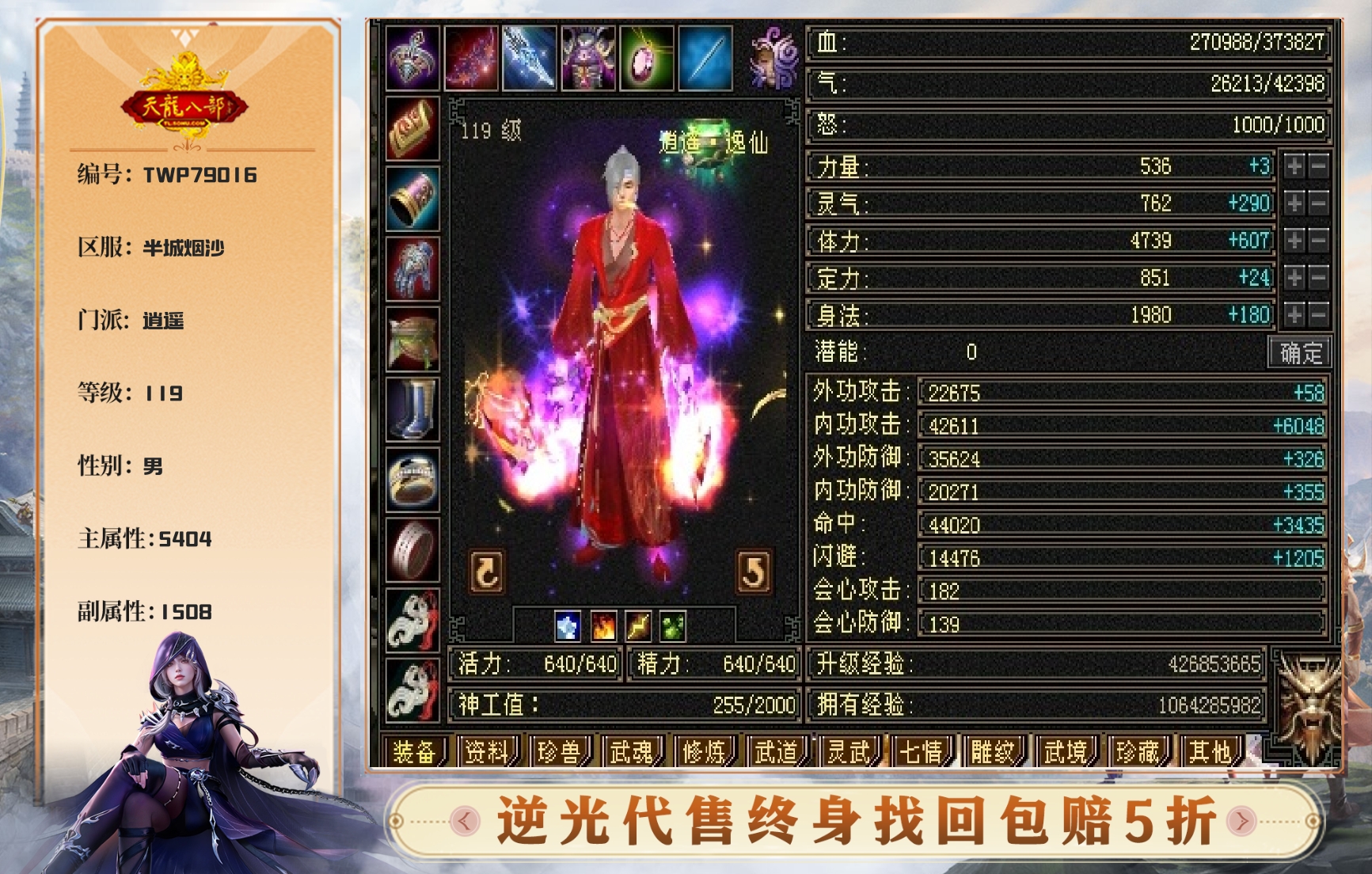 【TWP79016】 | 副属性:1508 | 等级:119 | 主属性:5404 | 男 | 主火攻 | 逍遥