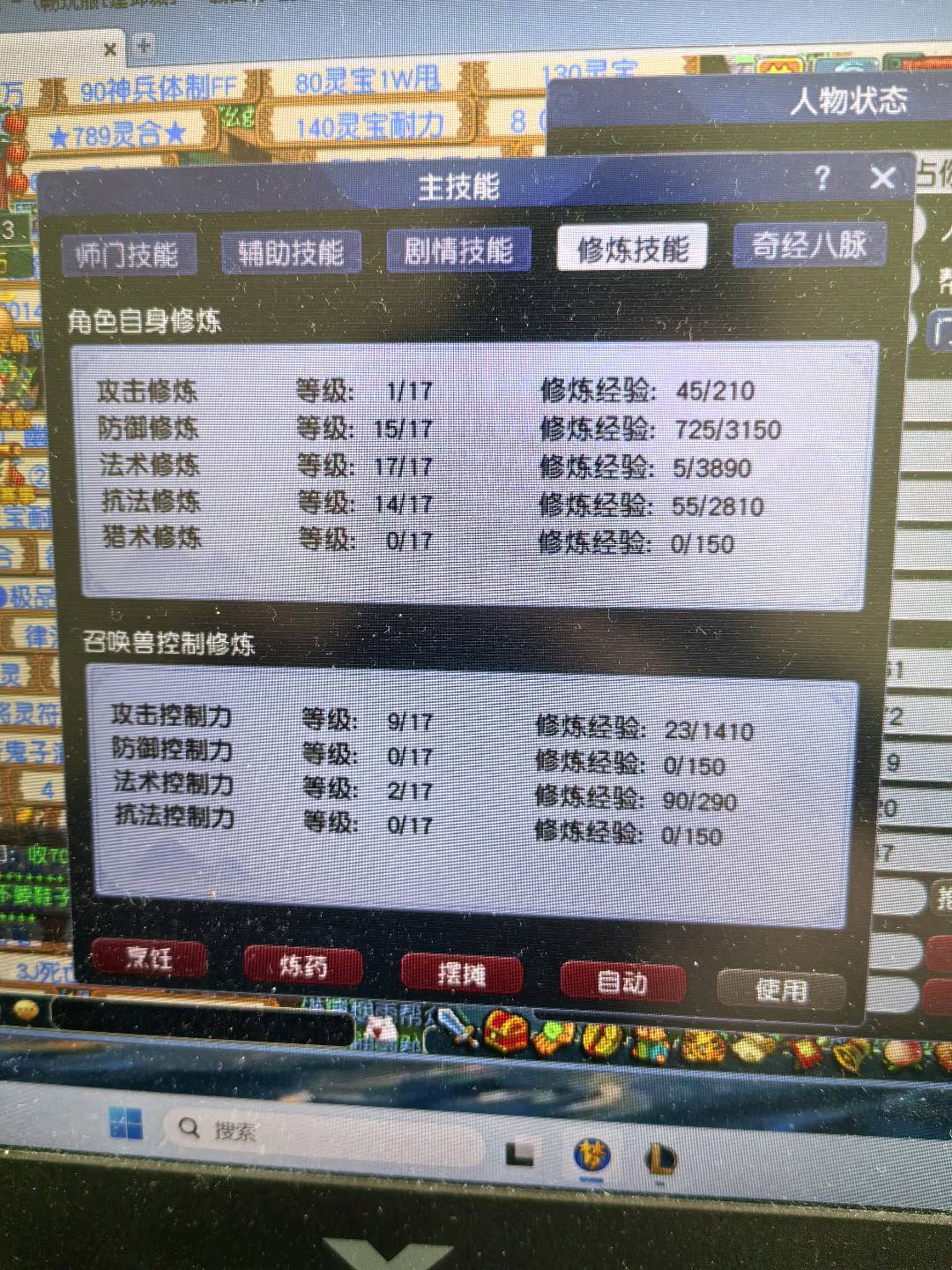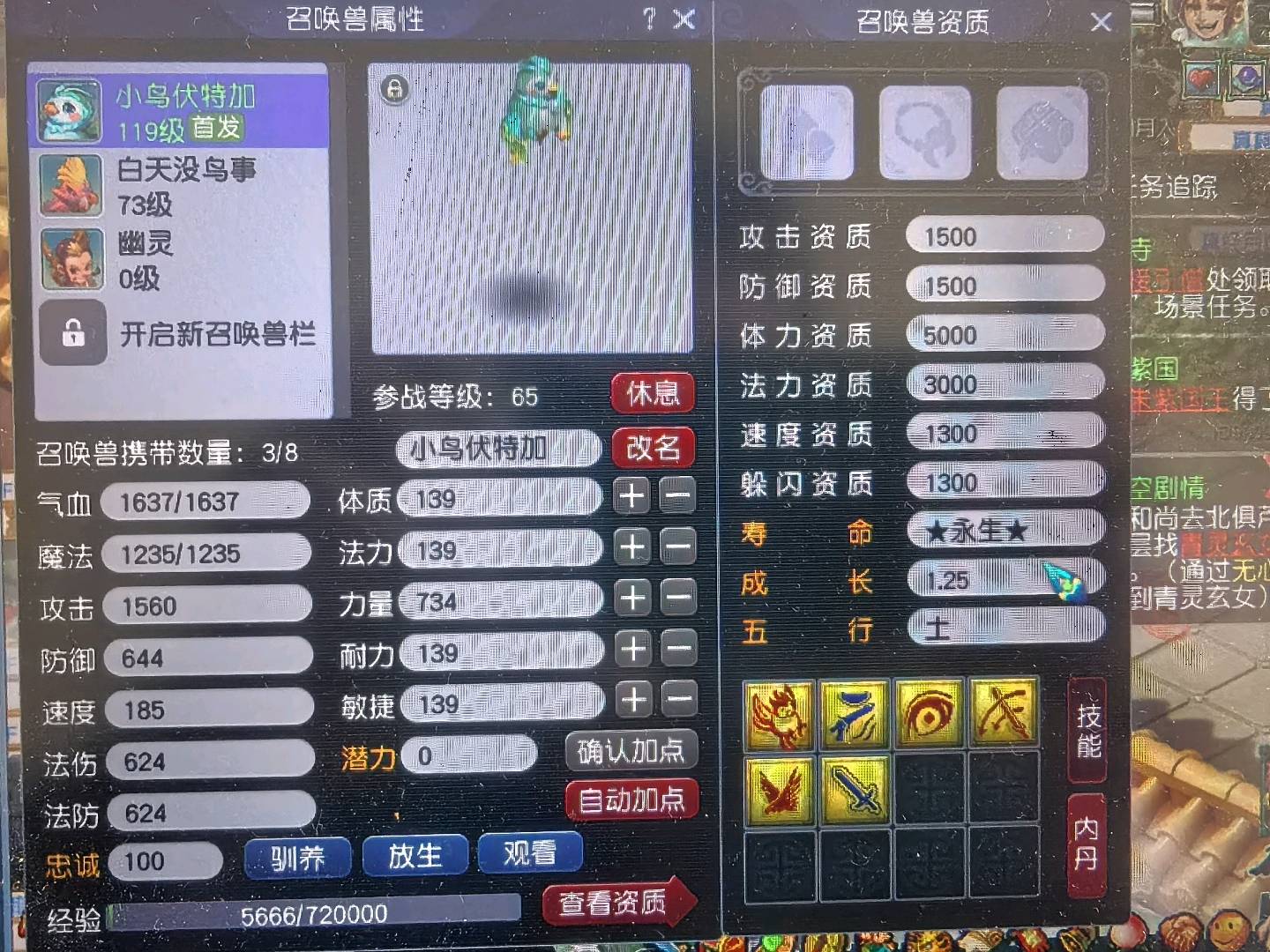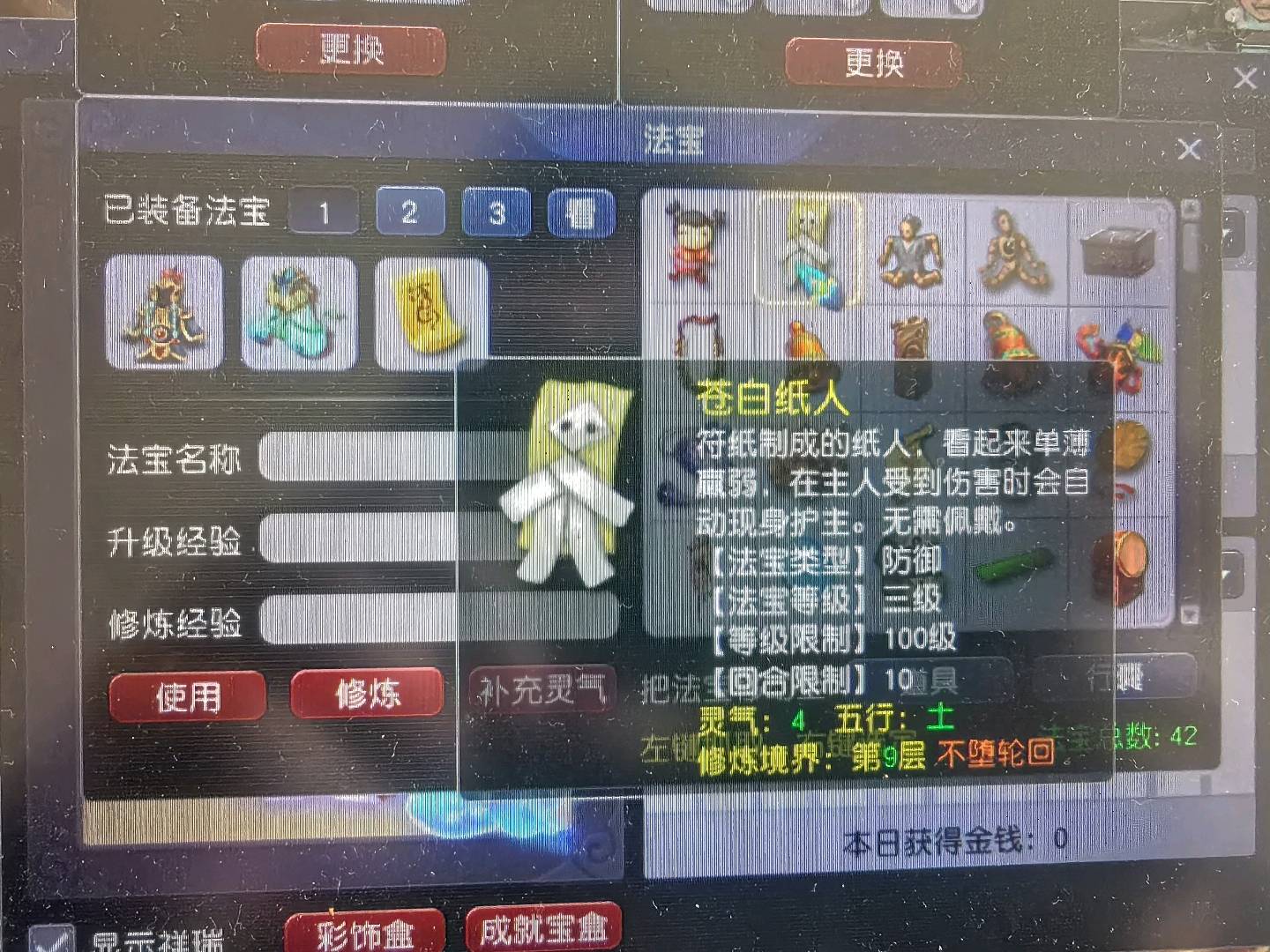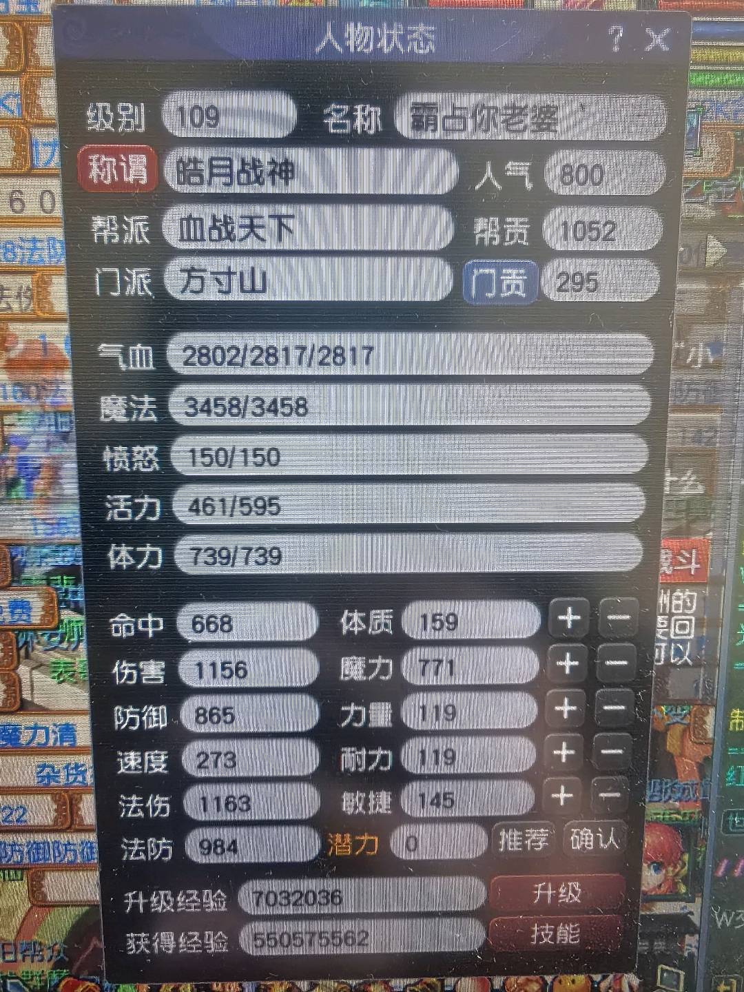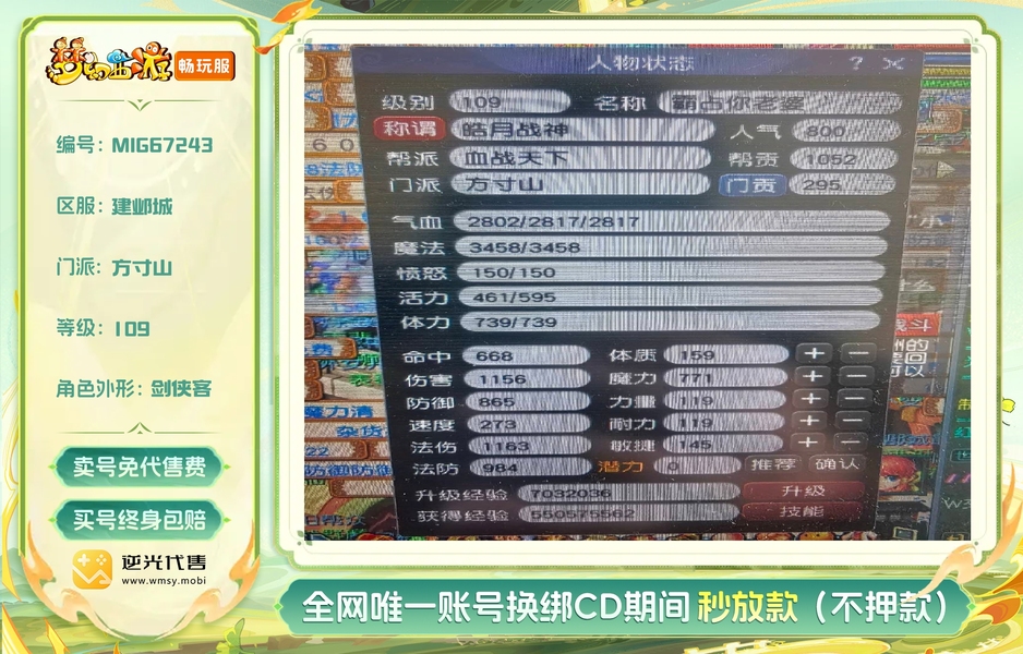 109方寸,11亿总经验,没浪费经验,号上还剩5.5亿经验。法宝42个,基本都有。带二转青鸾,一身装备任务非常好用。两套属性,有天阵。副本积分没用过有19000多,储备金还剩4000万修可以补满。有鲲有粉驴,号品非常好点化过3个变身,和一个定心一个杀死一个漫天。心血号啊每天玩10个小时。经验够飞升。