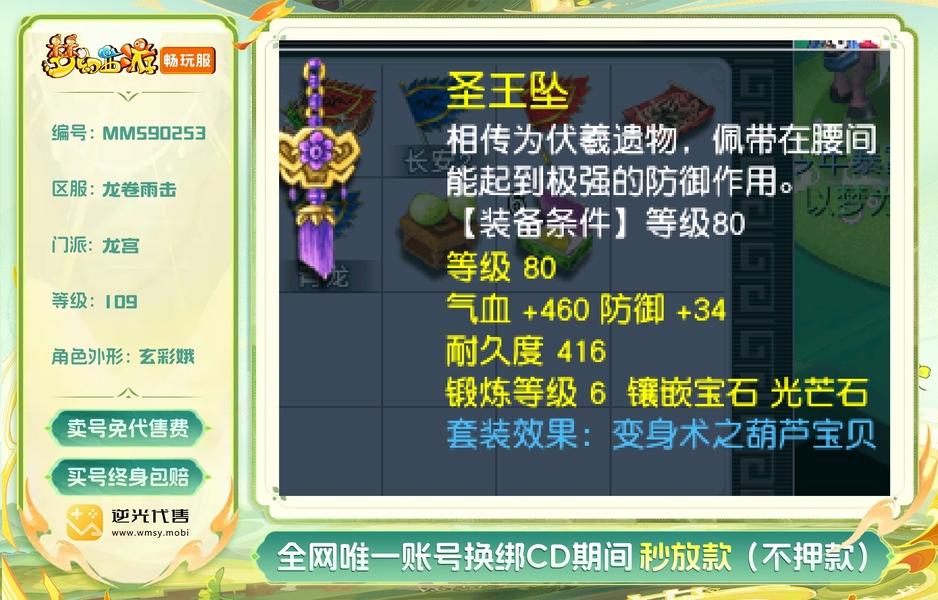一手心血号,带小极品武器衣服,爆属性葫芦套装,带宝宝,满层法宝,上号即刷,带现金储备,号上有1550玉,1万8副本积分。