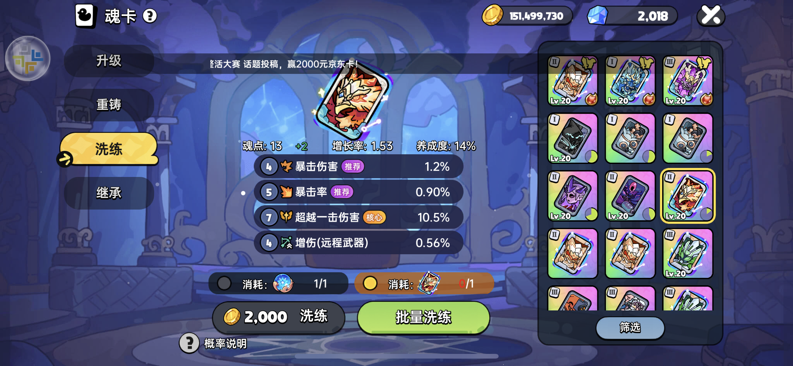 号上资源很多,8台,有cd到25号,新魂卡闪卡已准备好词条洗的差不多了,转生之魂马上保底,新神器目前30,祈愿还有个没拿,宝石共1混2,宝石保护卷19张够了,可以玩到共3,还有100多万猫币,2000钻石