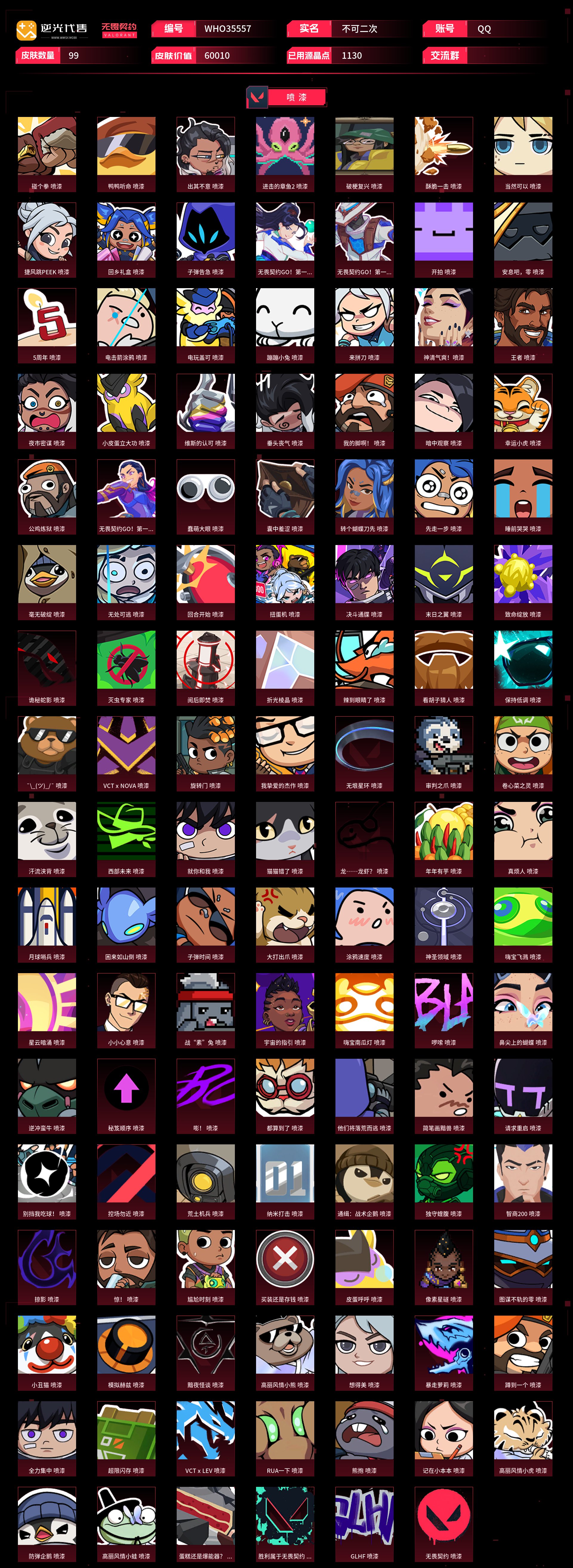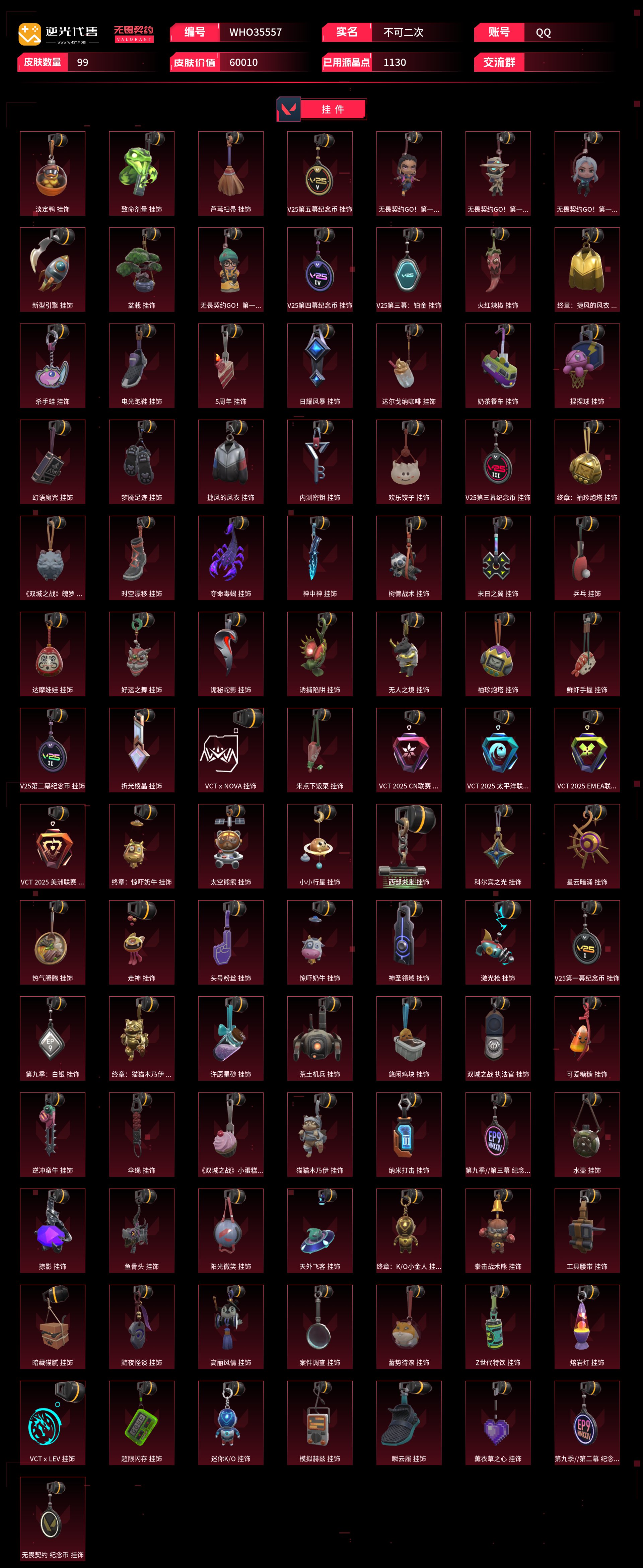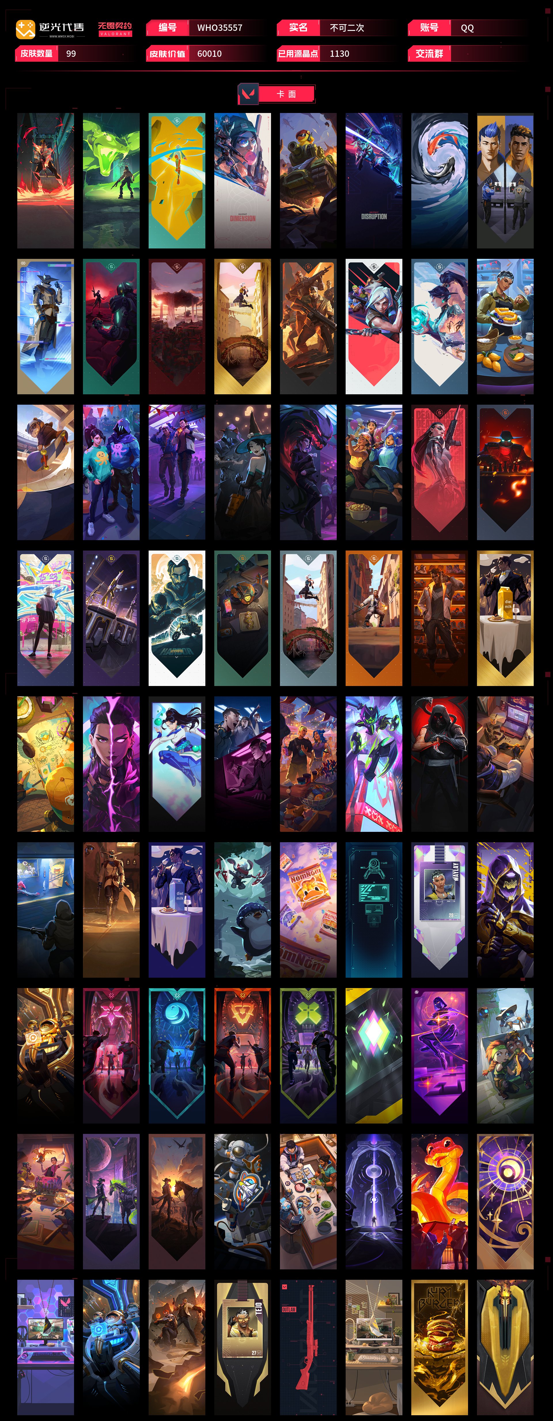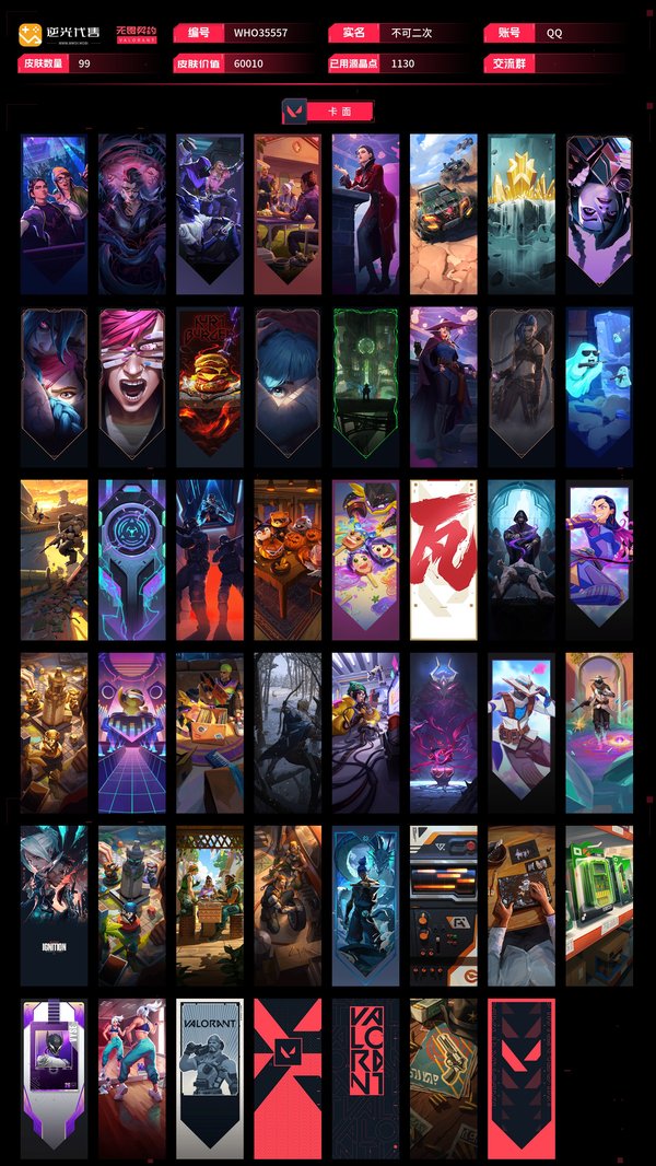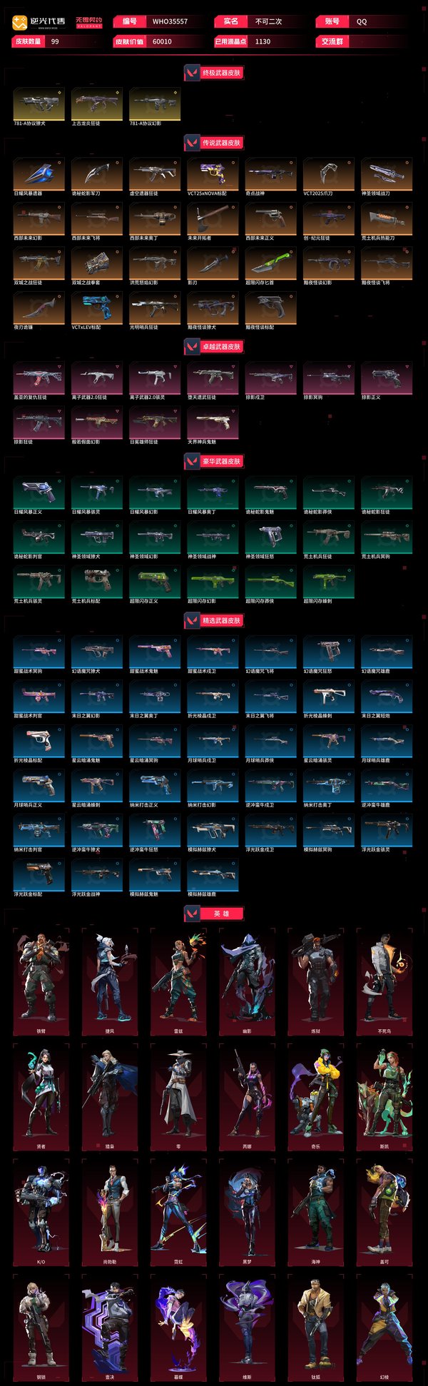 【WHO35557】 | 已用无畏点数:1130 | 卓越武器数量:11 | 传奇武器数量:26 | 终极武器数量:3 | 皮肤资产价值:60010 | 西部未来奥丁 | 夜刃诡镰、未来开拓者、荒土机兵热能刀、超限闪存匕首、诡秘蛇影军刀、日耀风暴遗器、神圣领域战刀、影刃、双城之战拳套、VCT2025爪刀 | 掠影戍卫 | 奇点战神 | 天界神兵鬼魅 | 西部未来飞将、黯夜怪谈飞将 | 西部未来正义、掠影正义 | 掠影冥驹 | 781-A协议幻影、般若假面幻影、西部未来幻影、洪荒怒焰幻影、黯夜怪谈幻影 | 781-A协议獠犬、黯夜怪谈獠犬 | 离子武器2.0骇灵 | 盖亚的复仇狂徒、虚空遗器狂徒、上古龙炎狂徒、光明哨兵狂徒、离子武器2.0狂徒、堕天遗武狂徒、日冕雄师狂徒、双城之战狂徒、创·纪元狂徒、掠影狂徒【买号找回永久包赔】