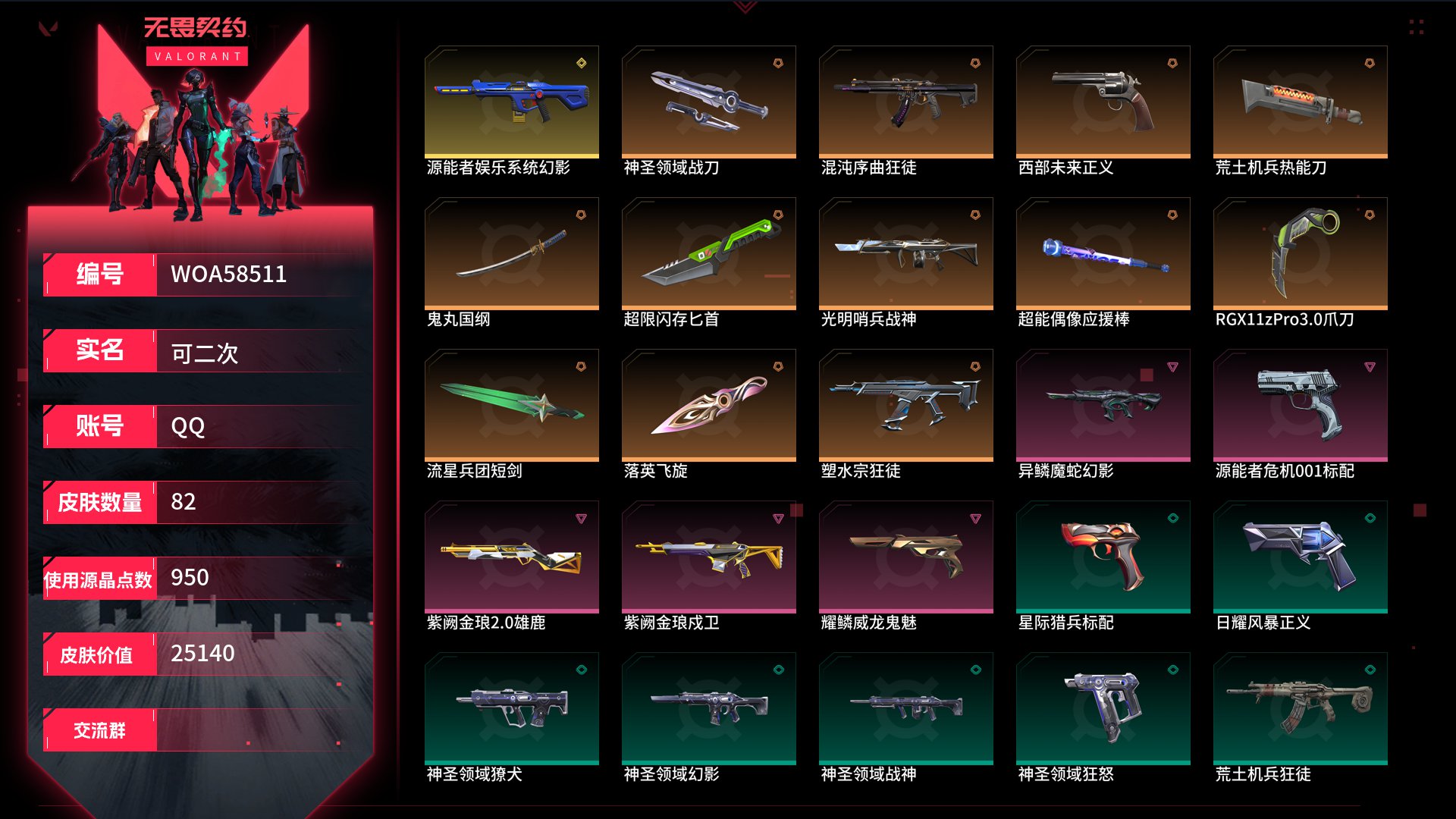 【WOA58511】 | 终极武器数量:1 | 皮肤资产价值:25140 | 卓越武器数量:5 | 传奇武器数量:12 | 西部未来正义 | 鬼丸国纲、RGX11zPro3.0爪刀、荒土机兵热能刀、超限闪存匕首、神圣领域战刀、流星兵团短剑、落英飞旋、超能偶像应援棒 | 紫阙金琅戍卫 | 源能者娱乐系统幻影、异鳞魔蛇幻影 | 紫阙金琅2.0雄鹿 | 光明哨兵战神 | 耀鳞威龙鬼魅 | 塑水宗狂徒、混沌序曲狂徒【买号找回永久包赔】
