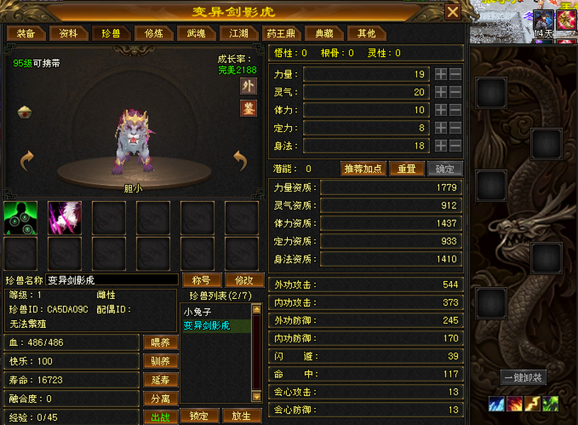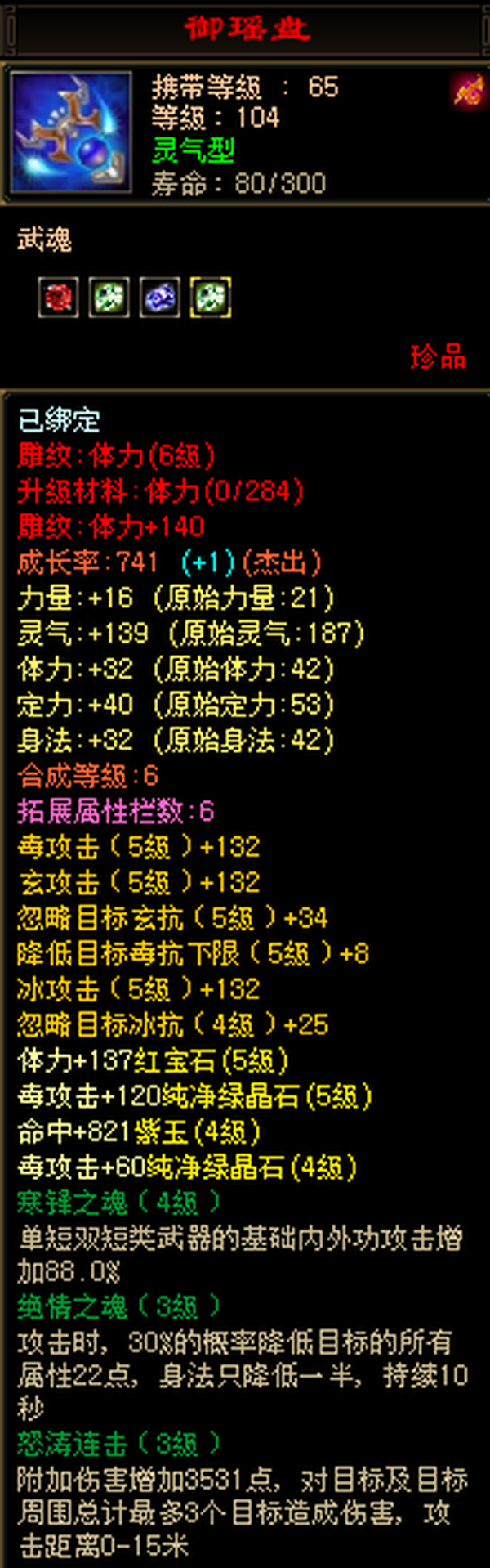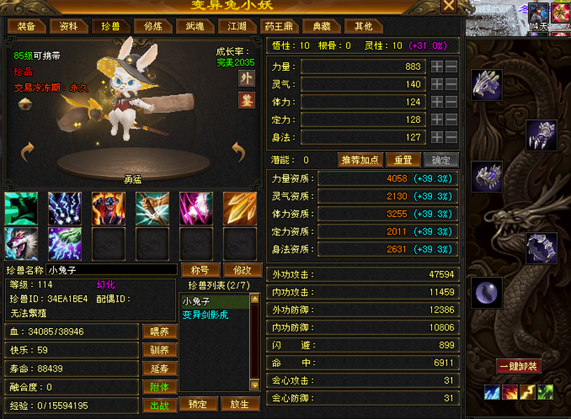 氪金图鉴 心魔 属性体力闪避命中4带5 雕文齐 元宝0 金0 附体已卖 属性要减掉 糖果已卖 还有个兔子在身上