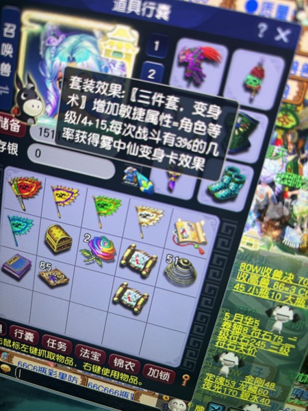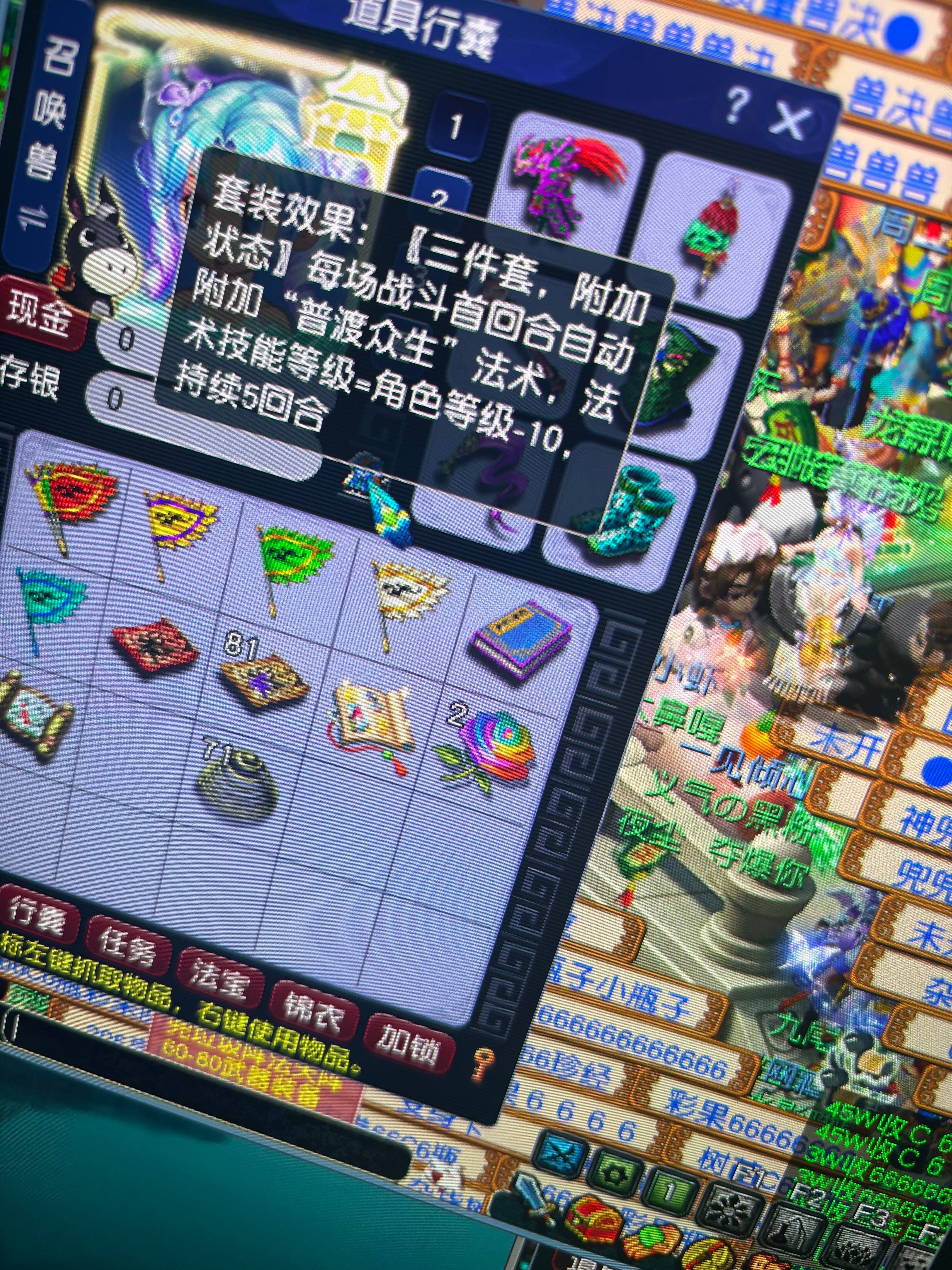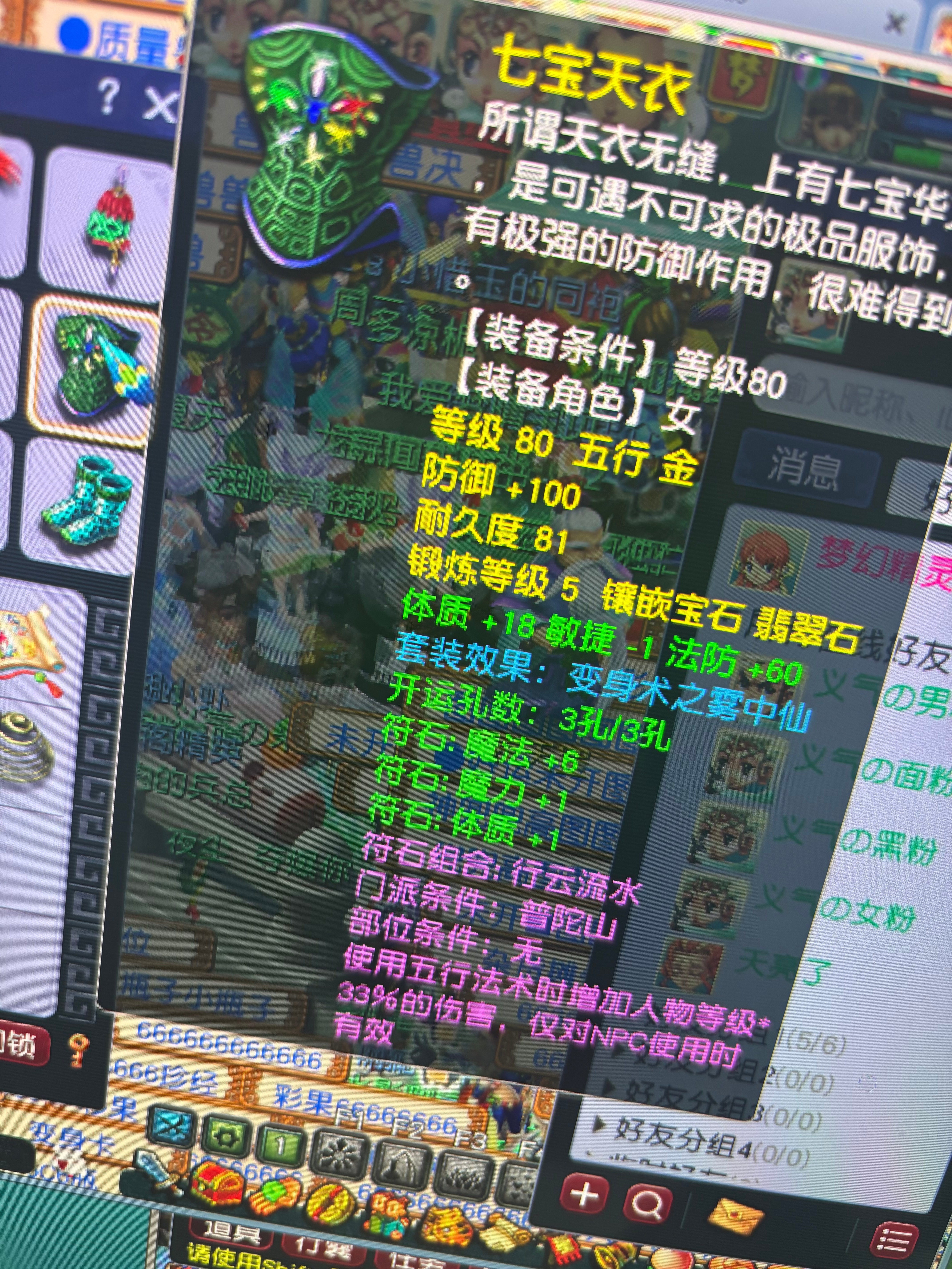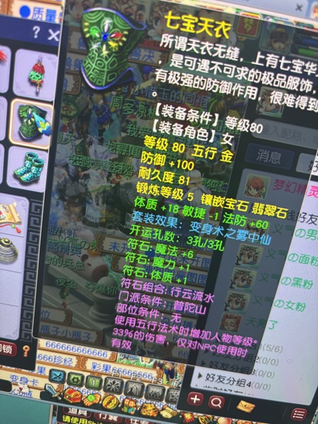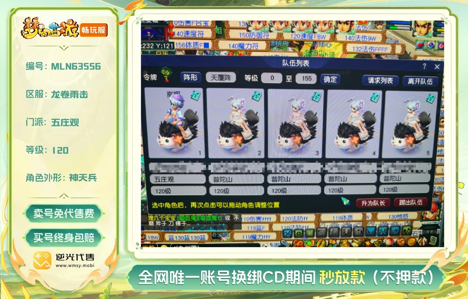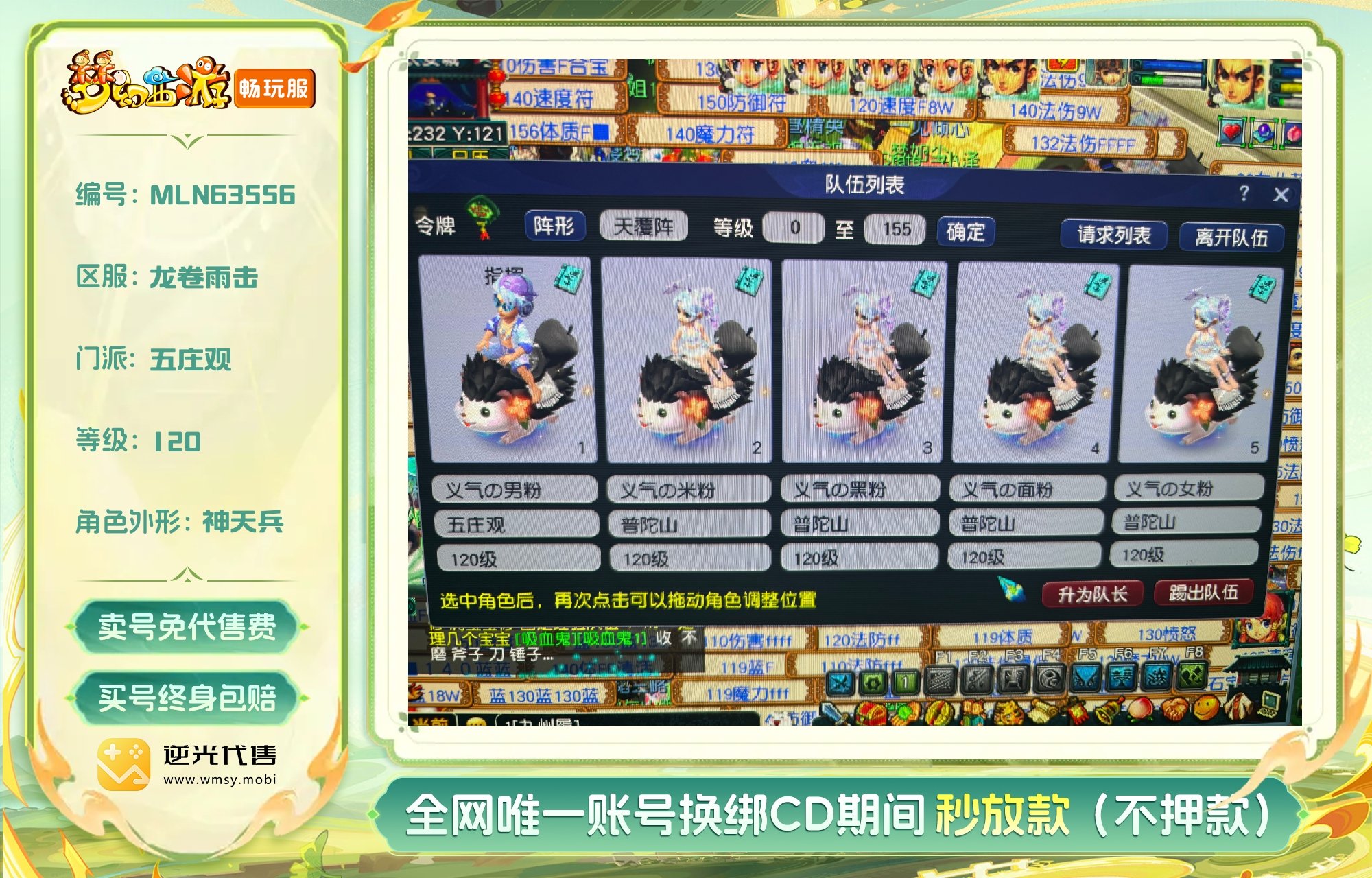 QWMALRC 号 卖一组 整组号浮生肖锦衣120级1WZ4PT阵容,五庄有天阵,每个号带4技能变异芙蓉 变异法老鼠 五庄高敏武器 高敏衣服 带普渡套 普陀三个普渡套加一雾中仙套 全部三孔 法宝齐全,副本积分五个号全1W多,全部已开3丹死了拉宝宝极省宝宝寿命,全部飞行坐骑都有,蓬莱封妖嘎嘎效率,