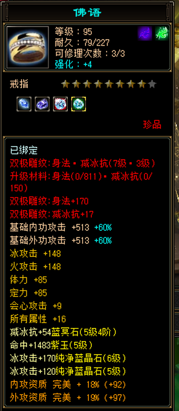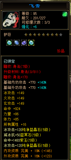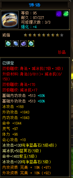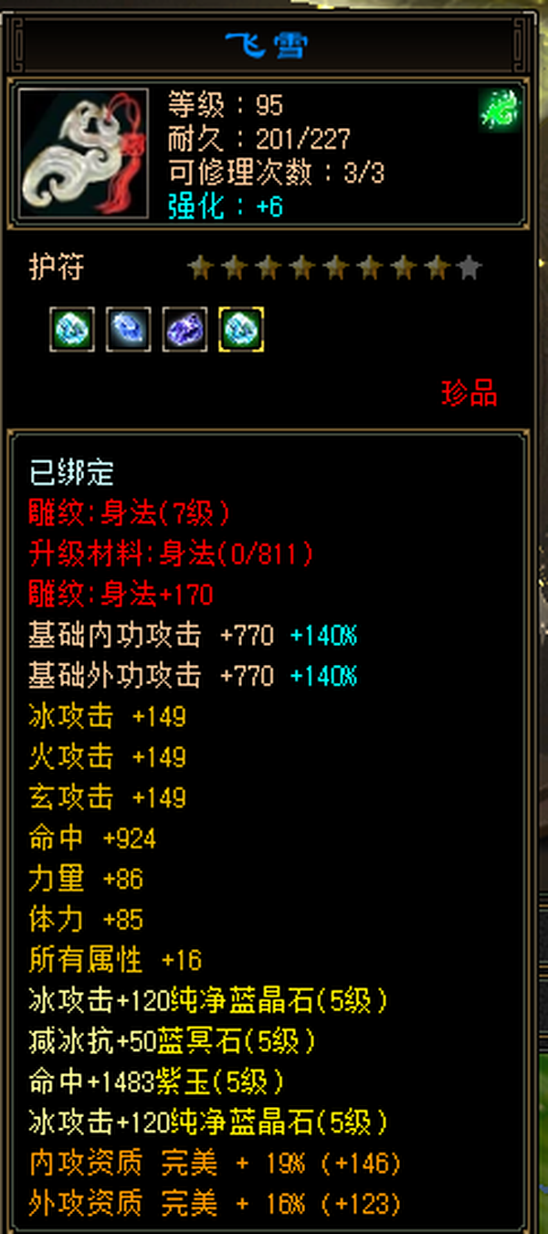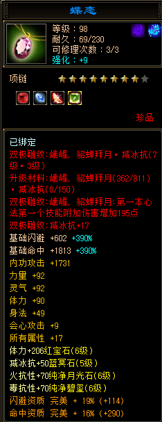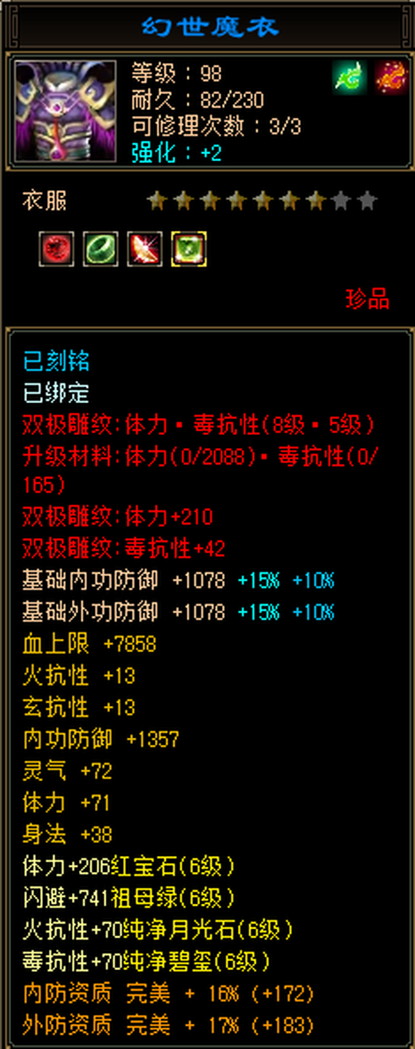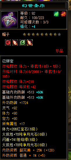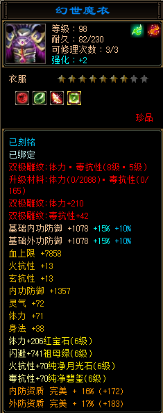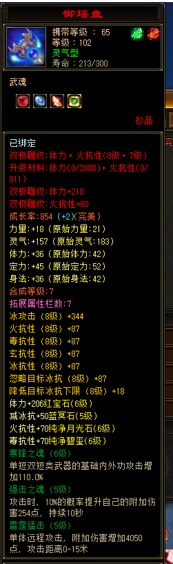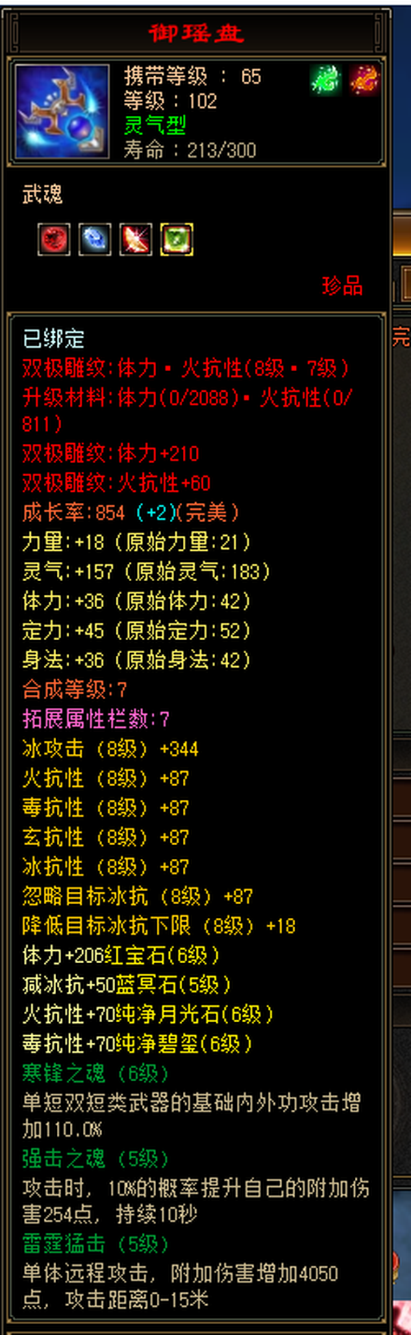 两折多点出六级峨眉直冲18万R消费660万元宝,全服第一花瓶,配饰幻视都是顶级,活动时装坐骑基本满,天雕基本满,2100抗,装备全身大8星,4只双十,包里还有3颗六级冰抗