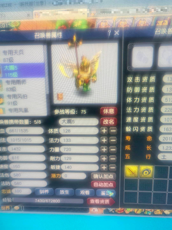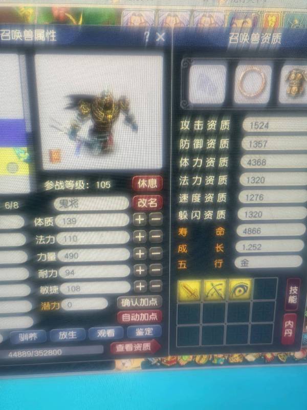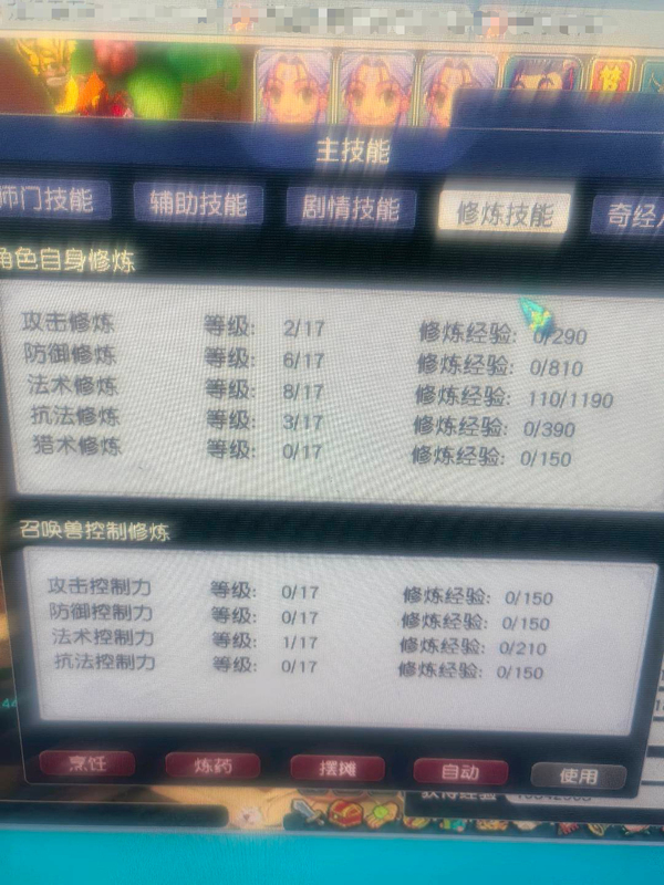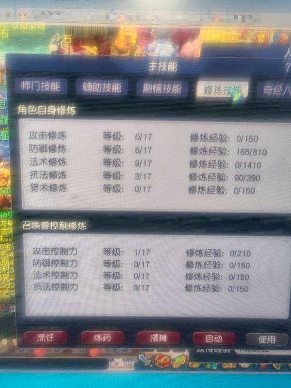 109的一组一五庄四盘丝,技能105,整组技能修炼如图,带成品一鬼将4巡游,盘丝都带孔装,平时捉鬼封妖挂机打