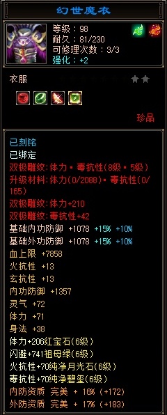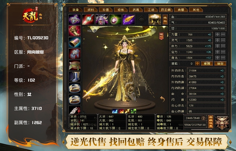 全服第一花瓶!花了20万R!火毒不是极限7,都能抗死,装备细节全身大8星都是R收,总抗2100,配饰幻视都是顶级,活动时装坐骑基本满,天雕基本满.4只双十,包里还有3颗六级冰抗, 已修改最低价