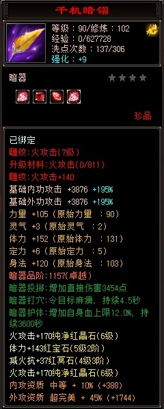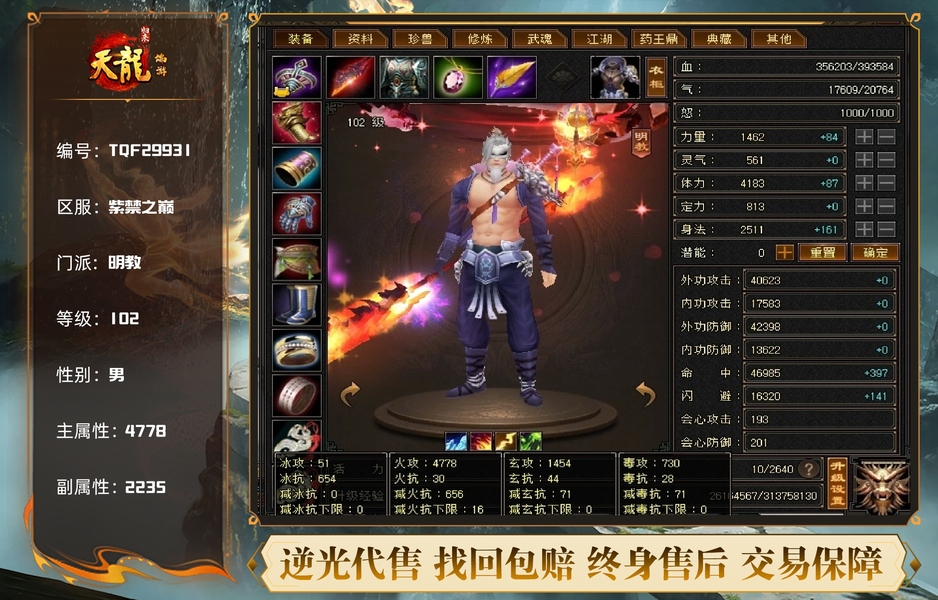 极限三修暴力明教,40W血4800属4W7命中全身雕文8带7,天雕差2身法其他全满,喜欢的接小刀