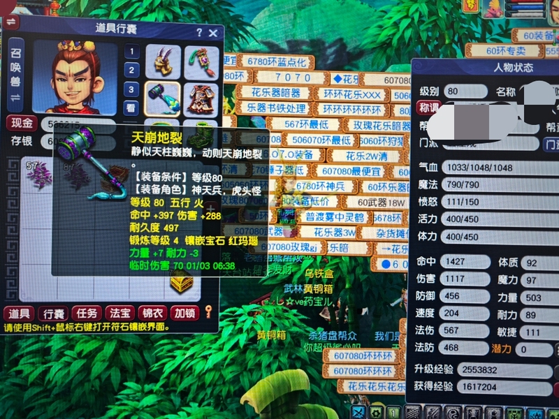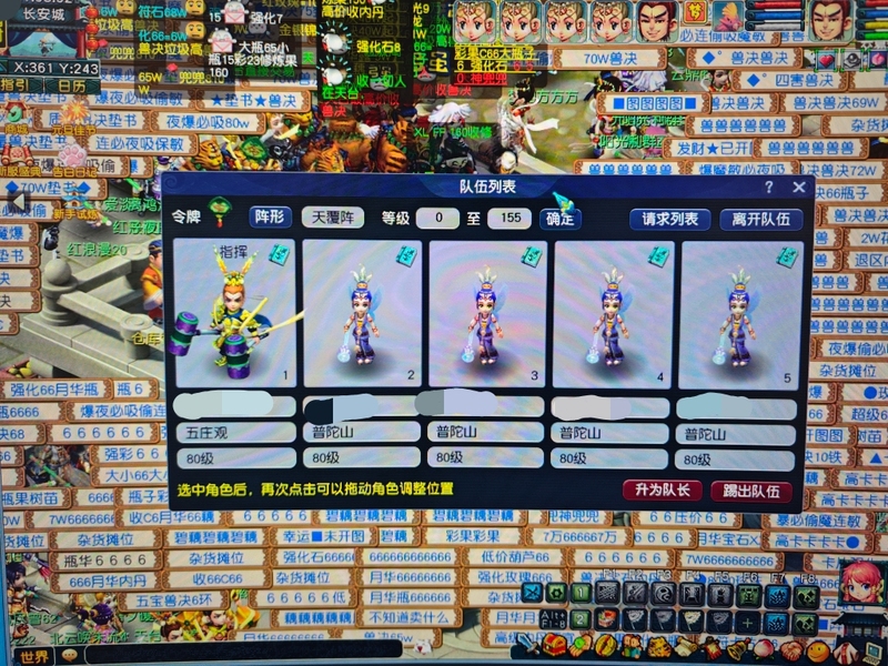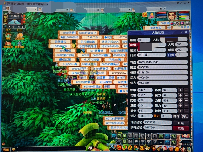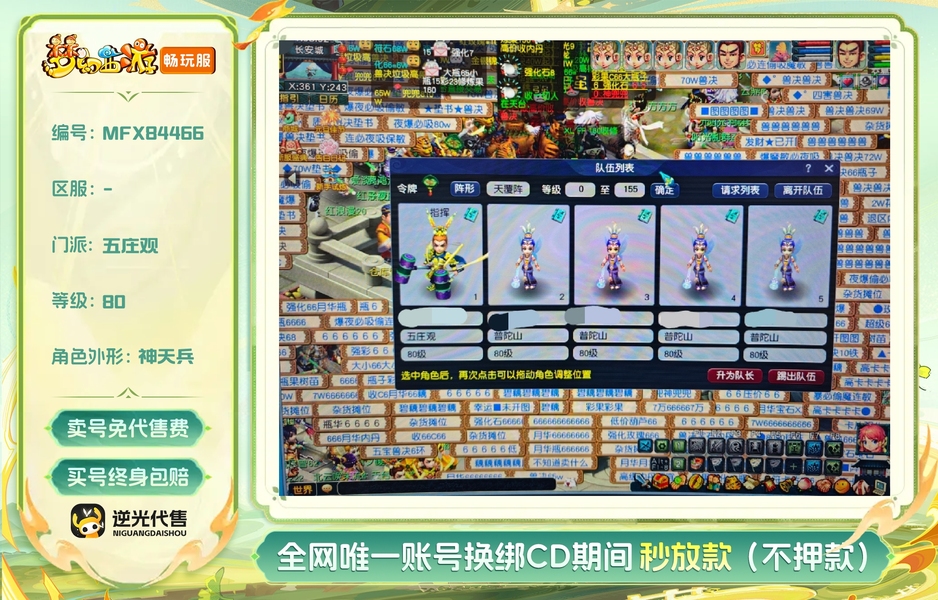天蓬一组80一五庄四普陀带天阵,价格是整组号五个一起的,不单卖。所有角色全身装备最低三段宝石,宝石可敲。武器全是780的,角色都有房跟练兽笼,号上一起还有几百万币子没清。过年事太多三个区玩不过来了,卡80级上手即玩美滋滋。