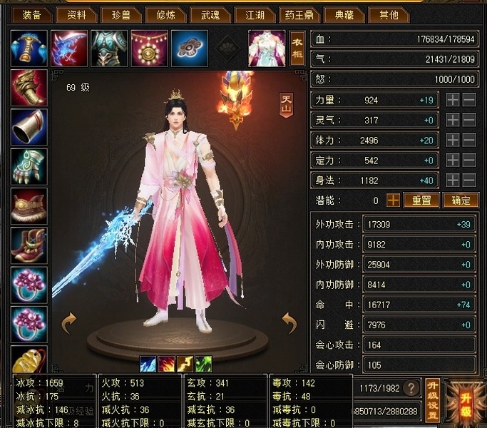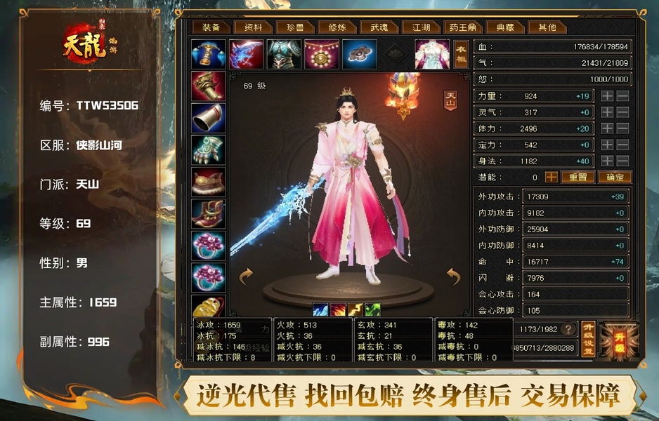 69卡级天山,雕纹满武魂拓展满,面板裸属,高级英雄帖已开,细节看图,防具项链提升空间大,年终4挡