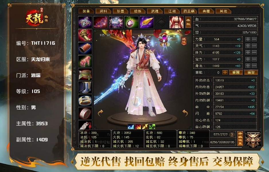 换号出,极品满5逍遥,两把幻视武器,三个永久85移速坐骑,人品号。年终回馈满。