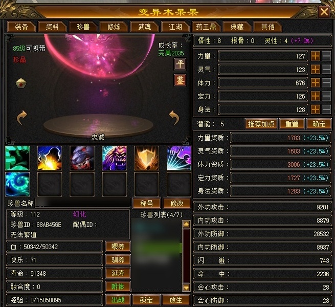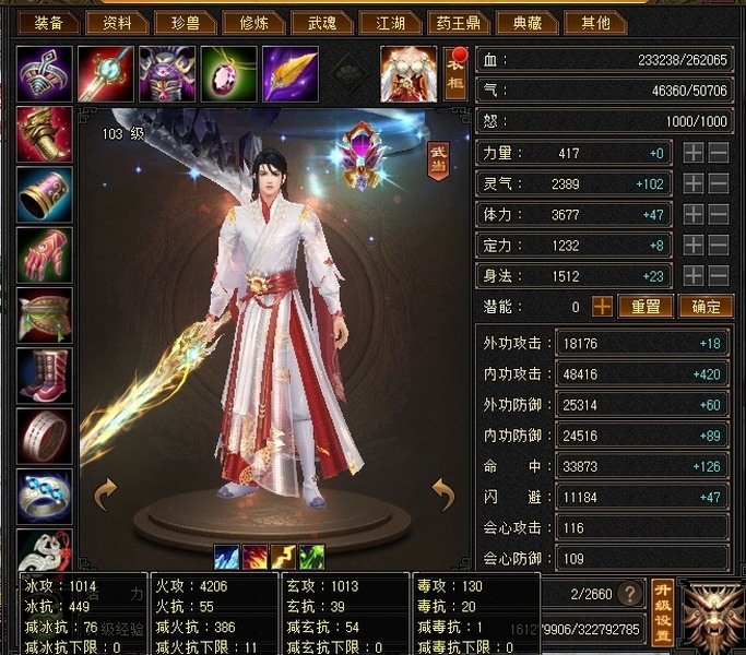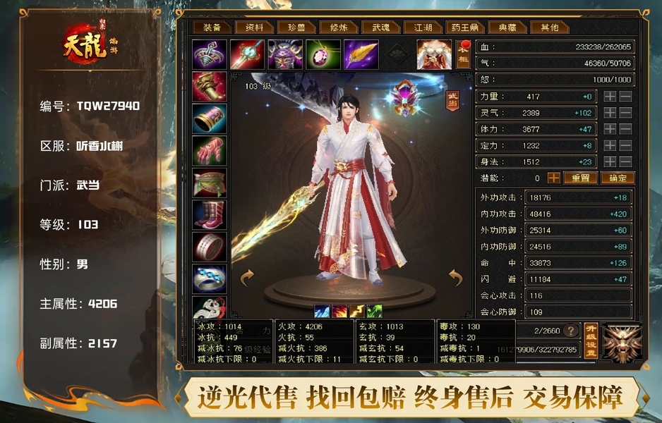 103级满五带6火武当 满状态30w 血 伤害贼高 玩够了 可以转逍遥 年终坐骑 宝宝 幻武 时装都有 好几个 付费永久坐骑 时装也有个 4 5套 裸属性4200 武魂8级火攻