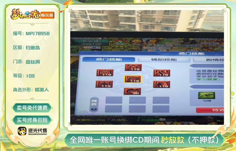 总经验:110000万 | 等级:109 | 盘丝洞 | 无换绑CD | 180天尊享特权 | 女 | 【逆光代售卖号0手续费】【买号找回永久包赔】