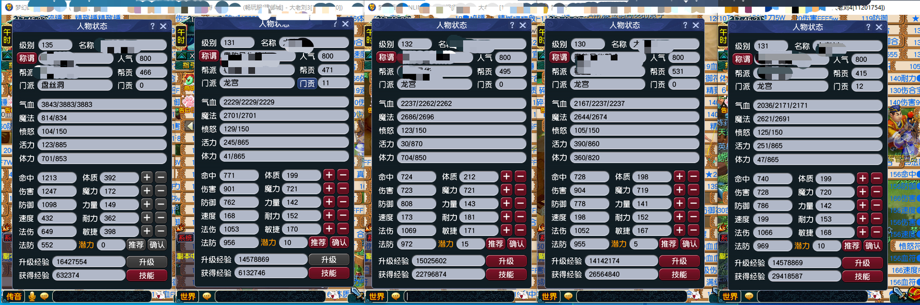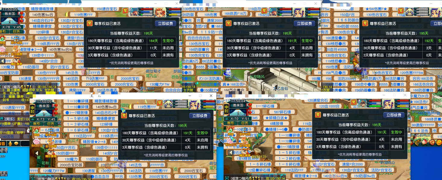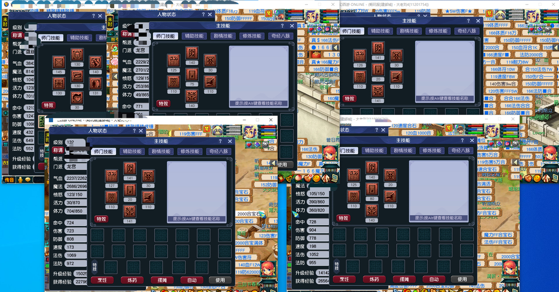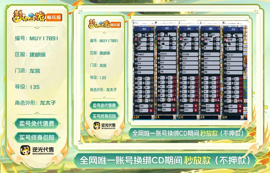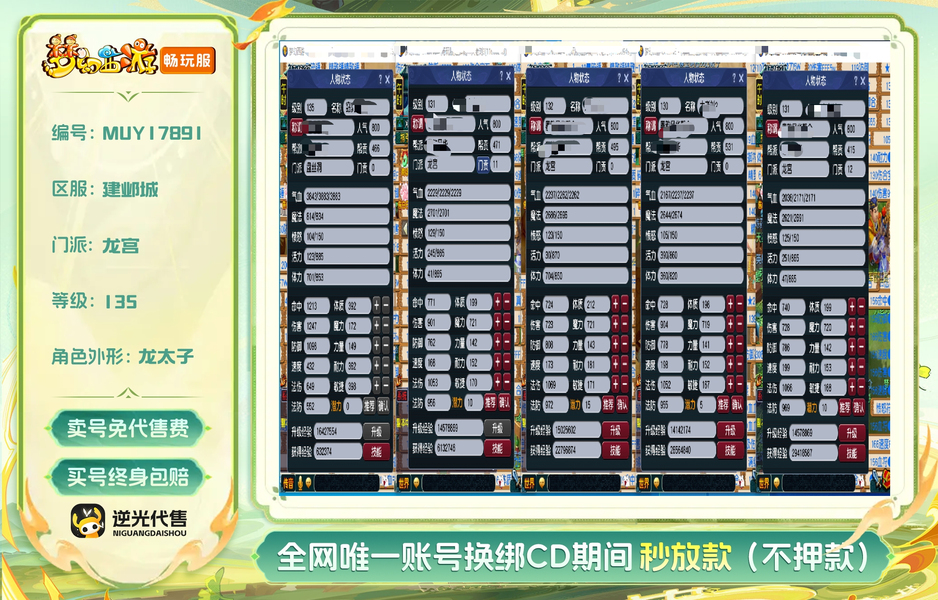 一盘丝四龙宫,每个号刚续费的540+60,这里就3000块了。五个加加起来还有3000咸鱼。盘丝飞升了,四个龙宫没飞,老婆要生了得照顾不能坐电脑前面的,号也是逆光买的,卖符技能都140以上,学了宝石工艺,不玩的时候摆摊卖符合宝石都有几十块。每个号一套任务装备加一只任务攻宠,识货爽快的来。