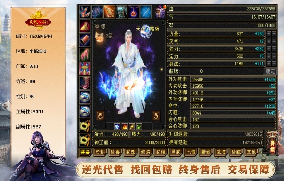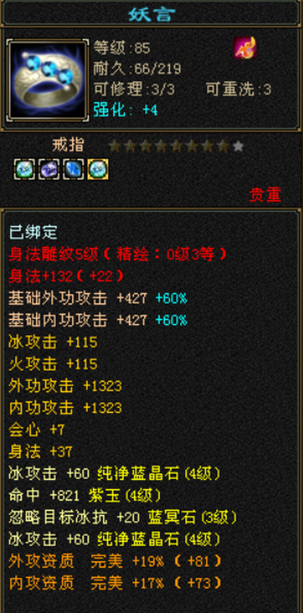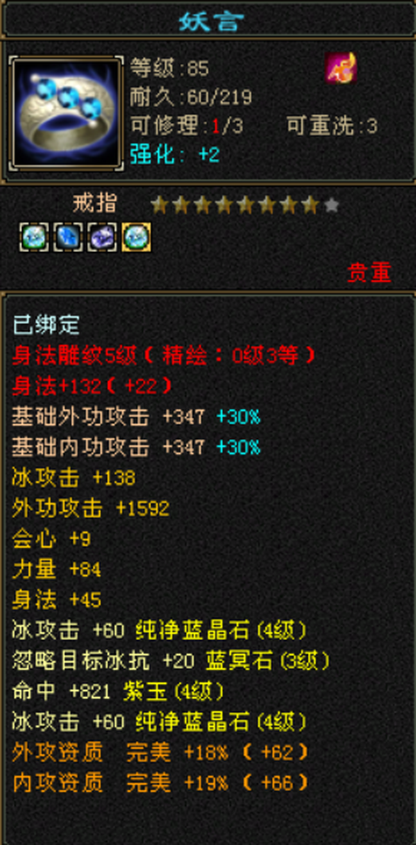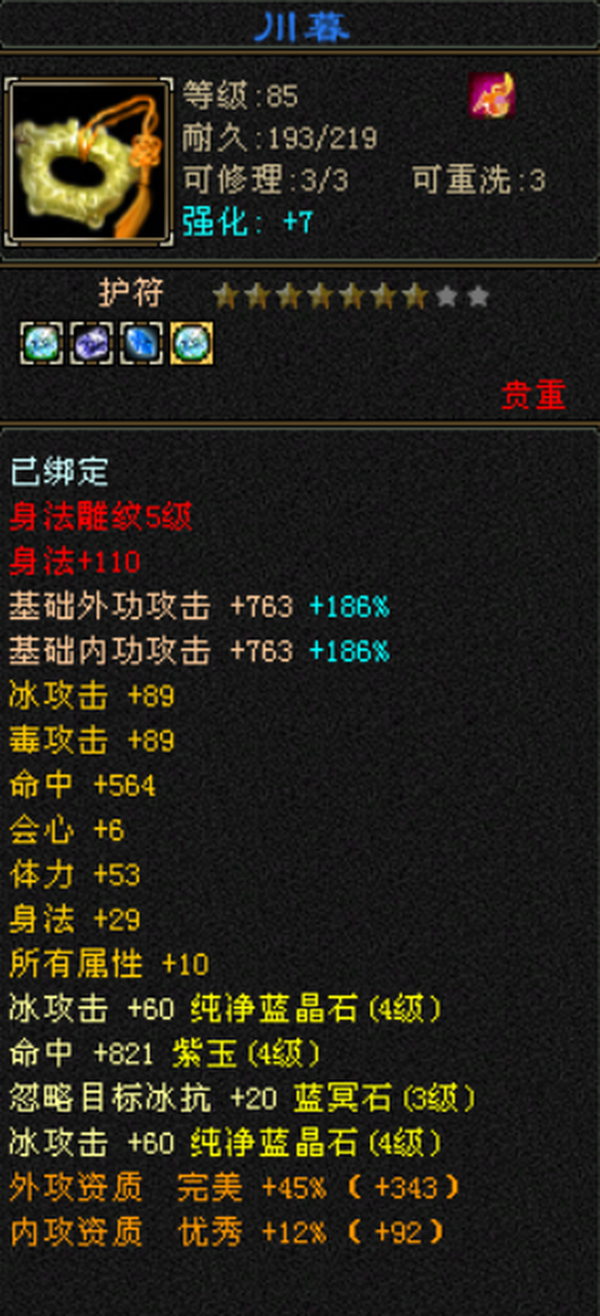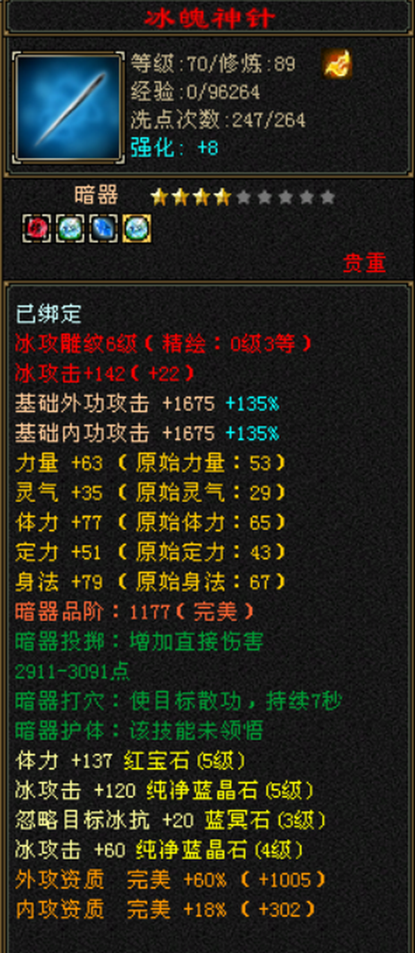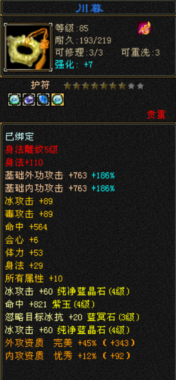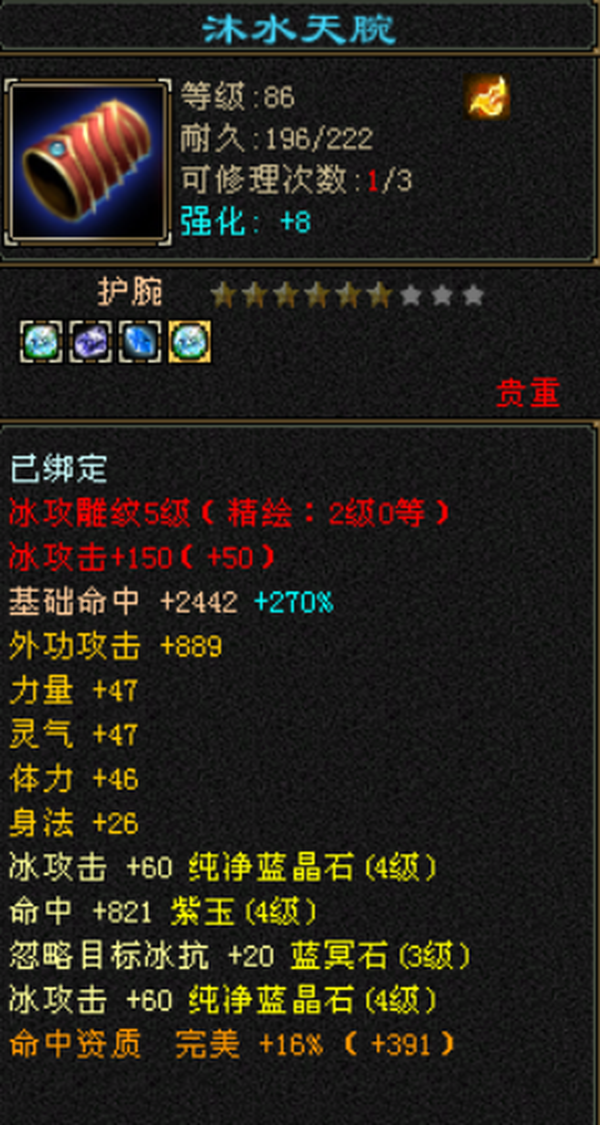 冰3401,血23.25,带8星帽子,3级青龙,手工很好,生活技能9矿。