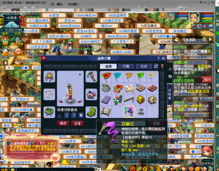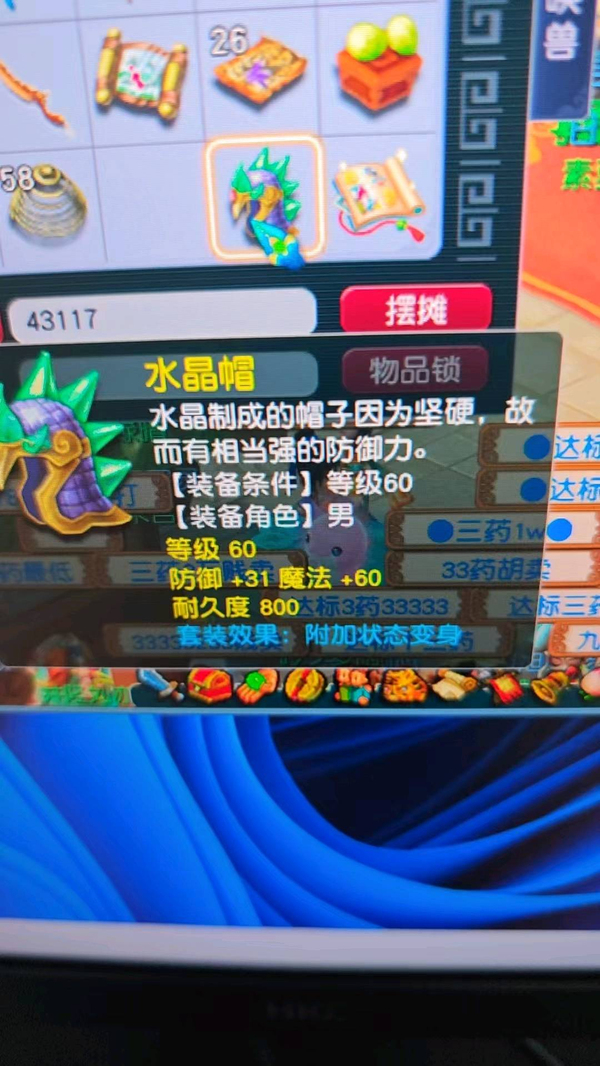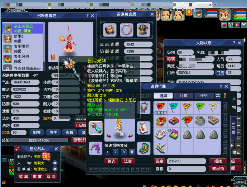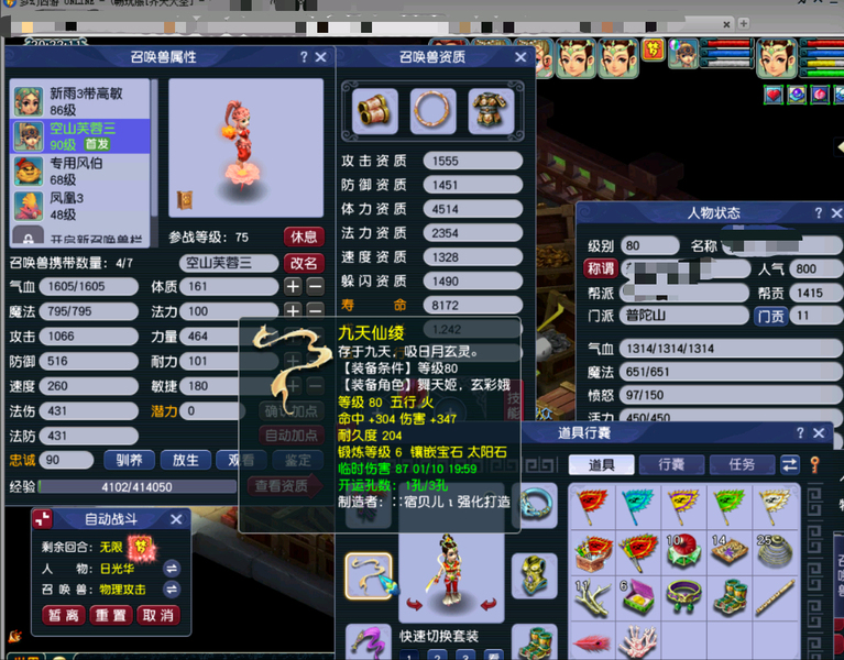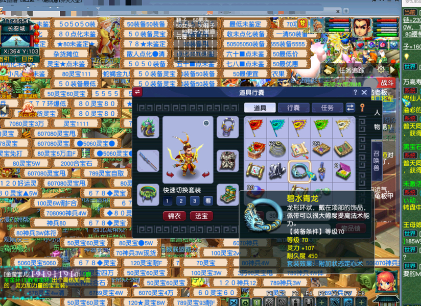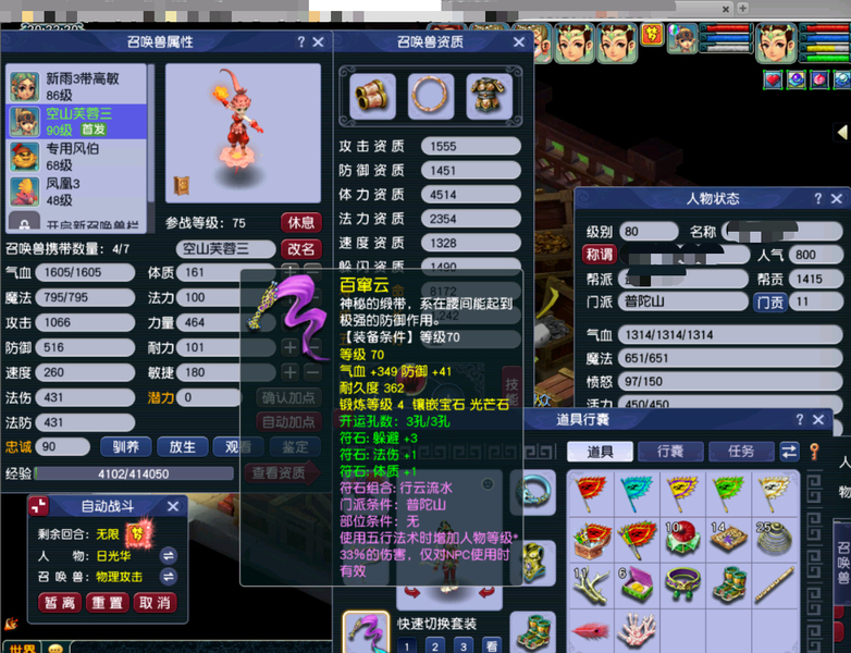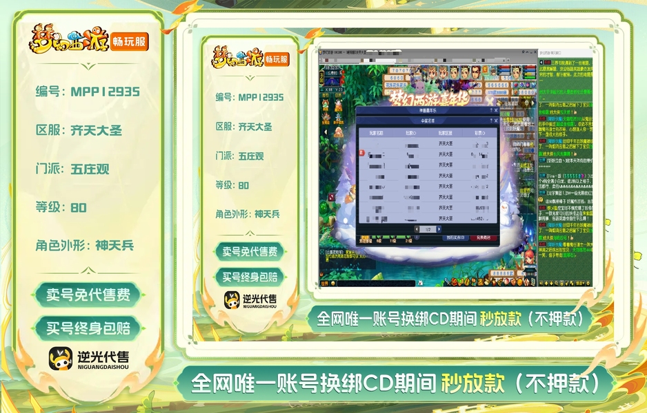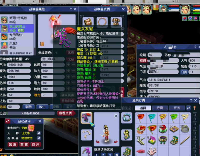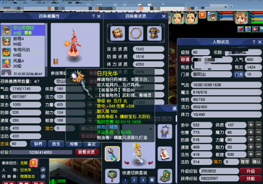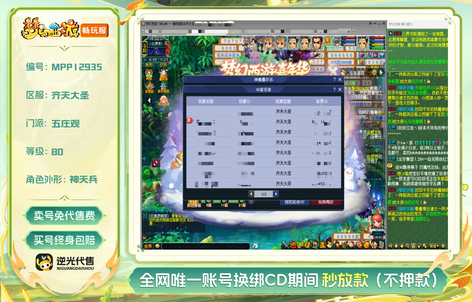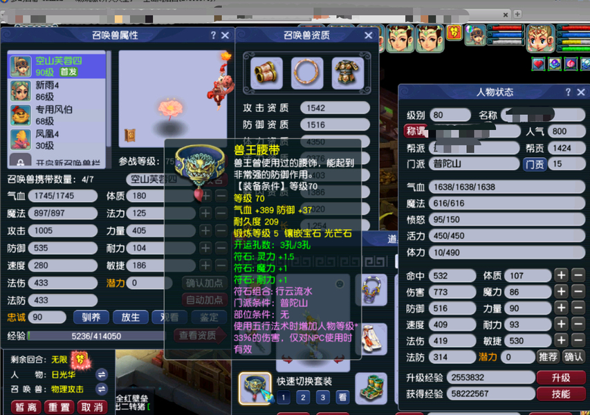 嘉年华中奖神兽超级必鲨的一组号,新手11.20注册的无敌爆炸运气的一组号,之前总共点化出过变身装备4次,定心鞋一次,定心项链一次,其他普渡装等,1.15晚上中神兽那个号又点化出变身炎魔神鞋子,卖了2800多w。1.19晚上中神兽号出80暴血变身腰带,五号出接近满防普渡女头,80暴血逆鳞腰带,变身卖了1亿多,五庄买了告白日记锦衣,五庄攻修10,普陀法修9,修炼每天都在点,帮派资材不用抢,全部5-6段宝石,都是高伤武器,,一组芙蓉都打了内丹,有十来件三孔装备。普通妖3回合,变异4-5回合。老婆3月份要生小孩了,没时间玩了,没卖之前,每天还会玩一二个小时。没截图到可咨询,逆鳞和普渡赠送了