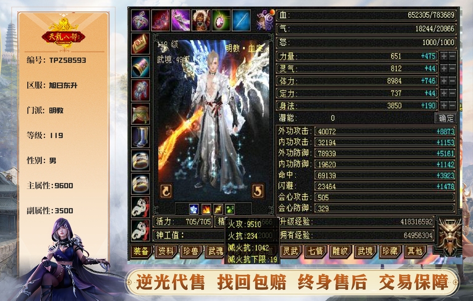 【TPZ58593】 | 明教 | 等级:119 | 主属性:9600 | 副属性:3500 | 男 | 主火攻 | VIP6 | 畅游账号
