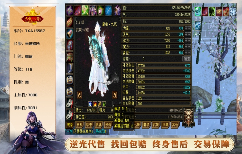 一毛不刀,爱买不买,裸属7112,全6四修,6个6级新雕文,无敌丹,全身大八星装备,灵武更新完毕,特价一分都别砍,还价的自己去升新6雕