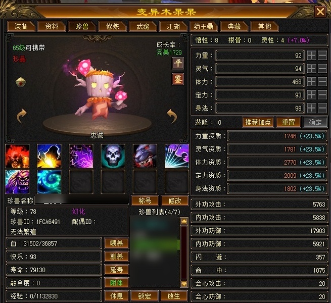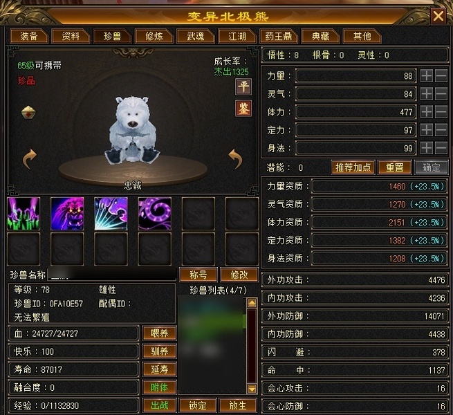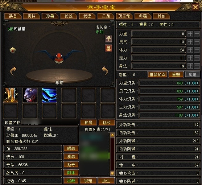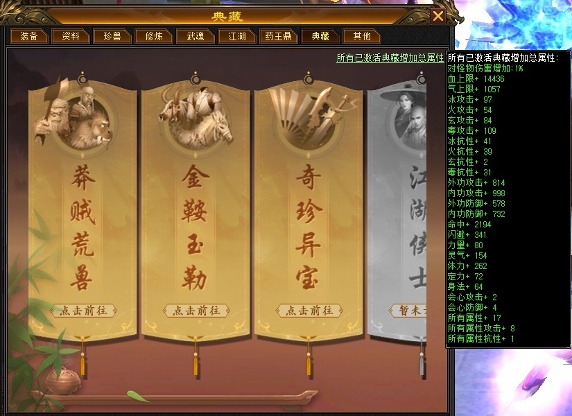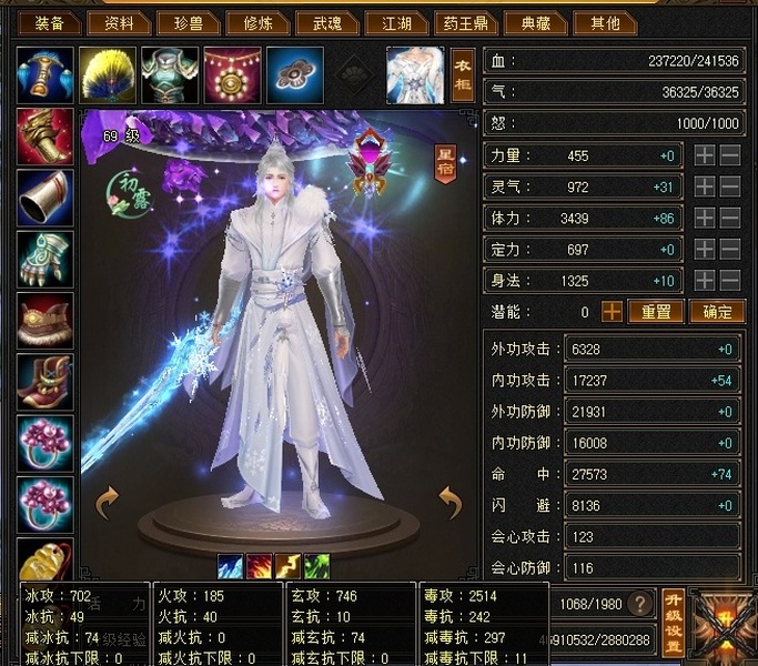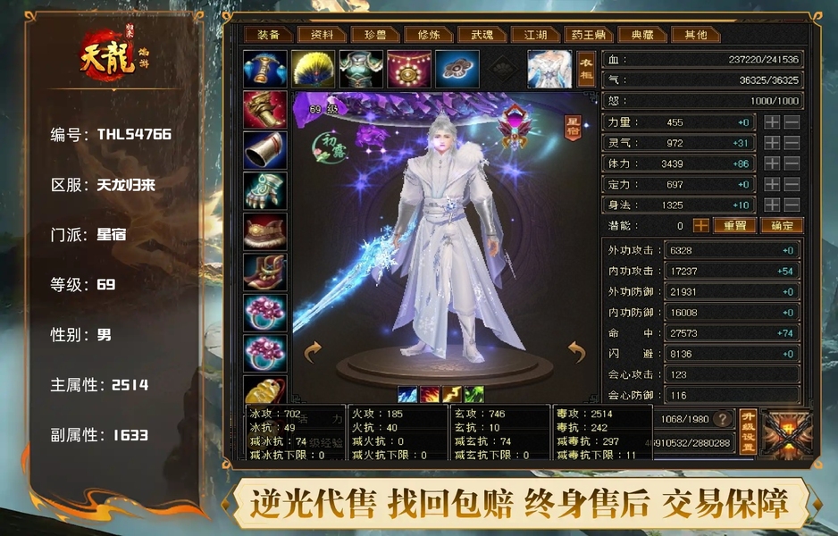 5体5属5命中4减抗暴力星宿,带30附体和成品PK宝宝,仓库还有3套4级抗性、2个4级减抗,一共4套4级抗,幻视冰剑3级,永久85%移速坐骑,包里加商会上架物资一共还有3000多金