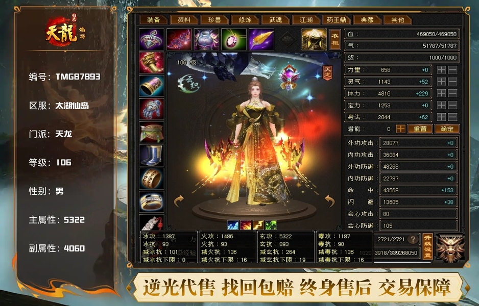 【TMG87893】 | 天龙 | 等级:106 | 主属性:5322 | 副属性:4060 | 女 | 主玄攻