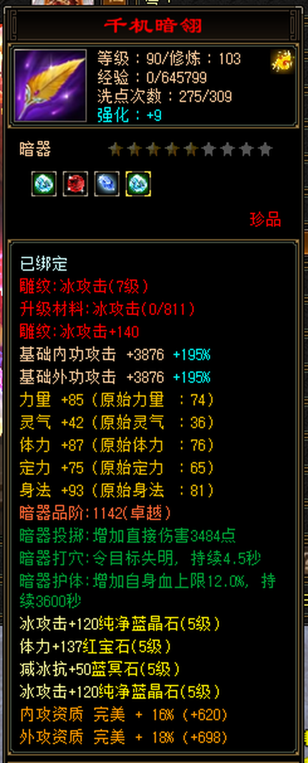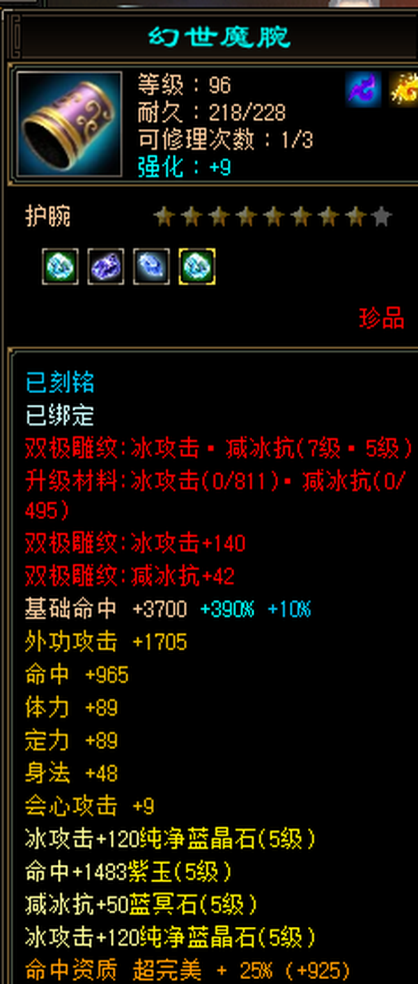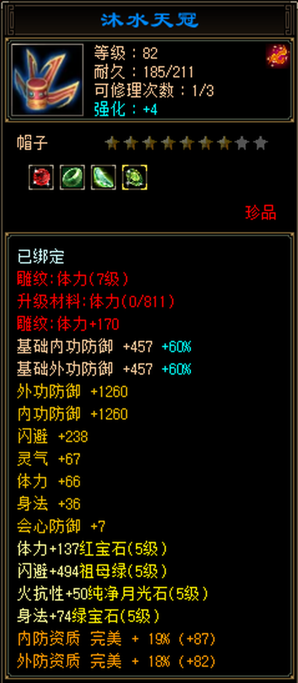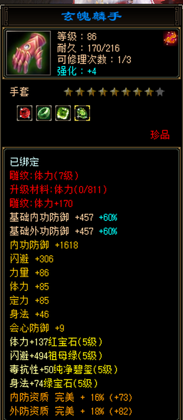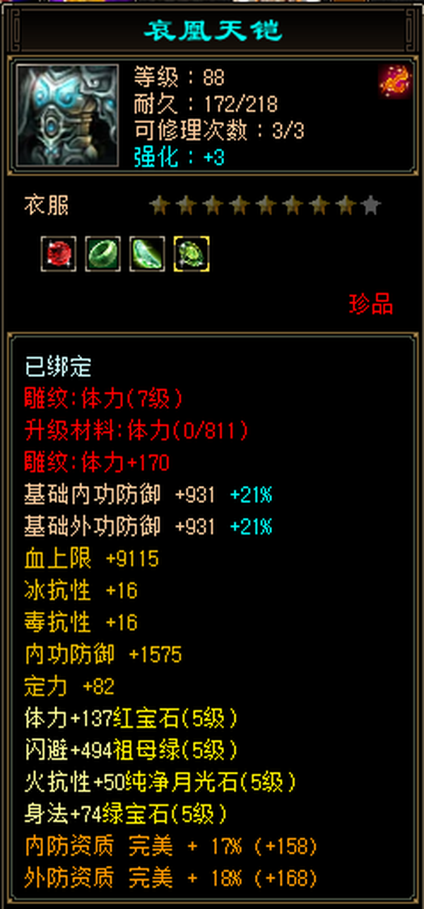 充值5w,18下线,极限5,满5减,高命中会心,强化9无成品号需投资,天雕差两个减抗,其它全部满七雕带八雕,随便搞搞减抗上700,5级精华状态