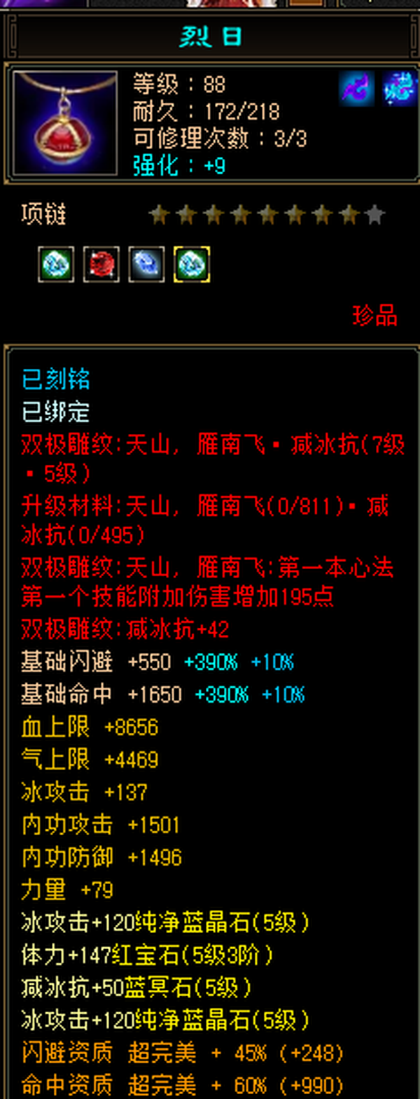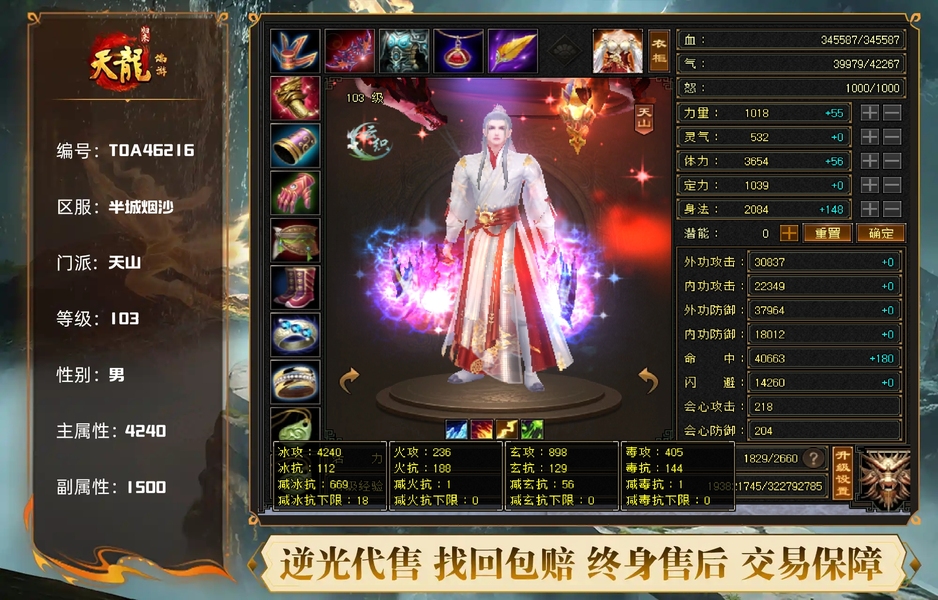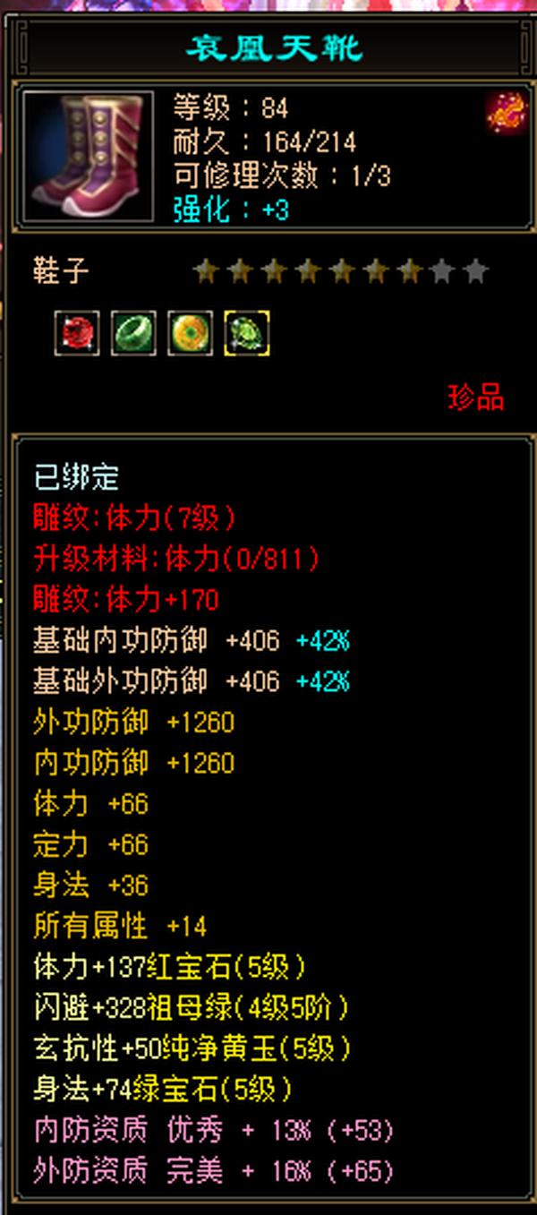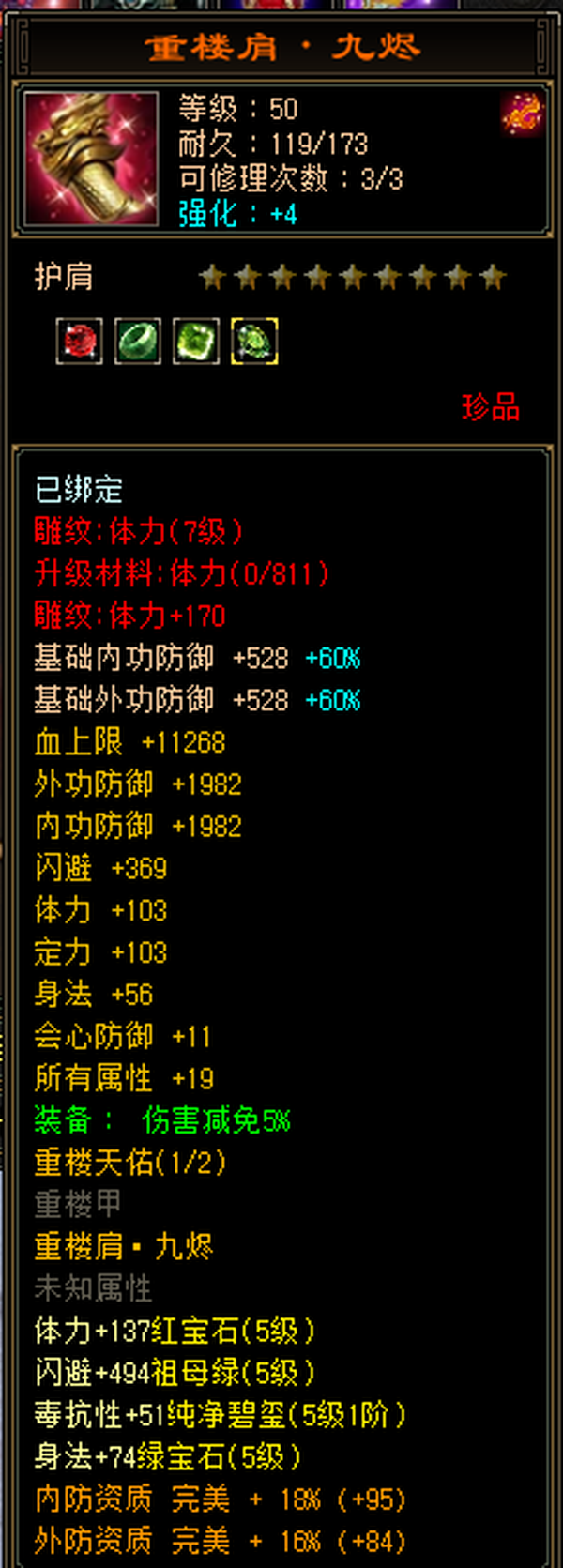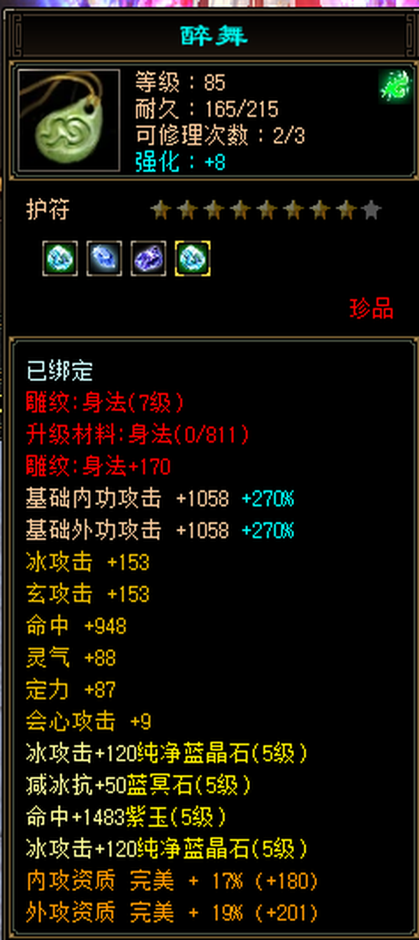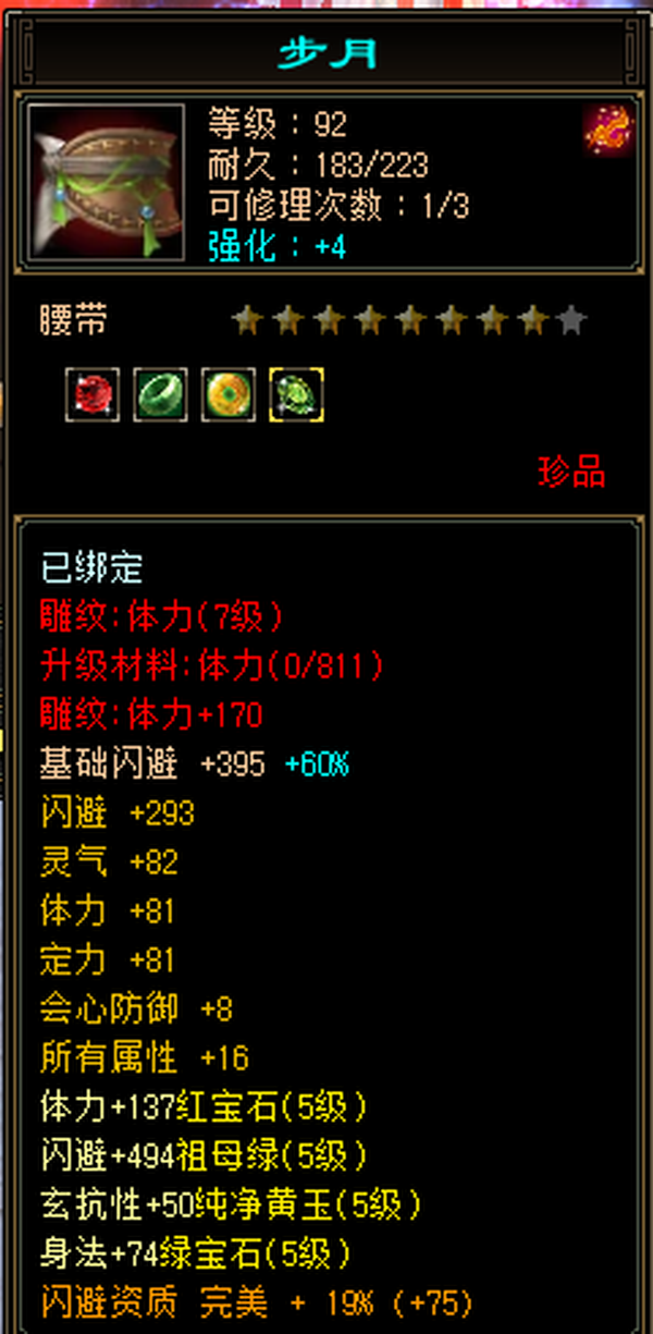 充值5w,18下线,极限5,满5减,高命中会心,强化9无成品号需投资,天雕差两个减抗,其它全部满七雕带八雕,随便搞搞减抗上700,5级精华状态