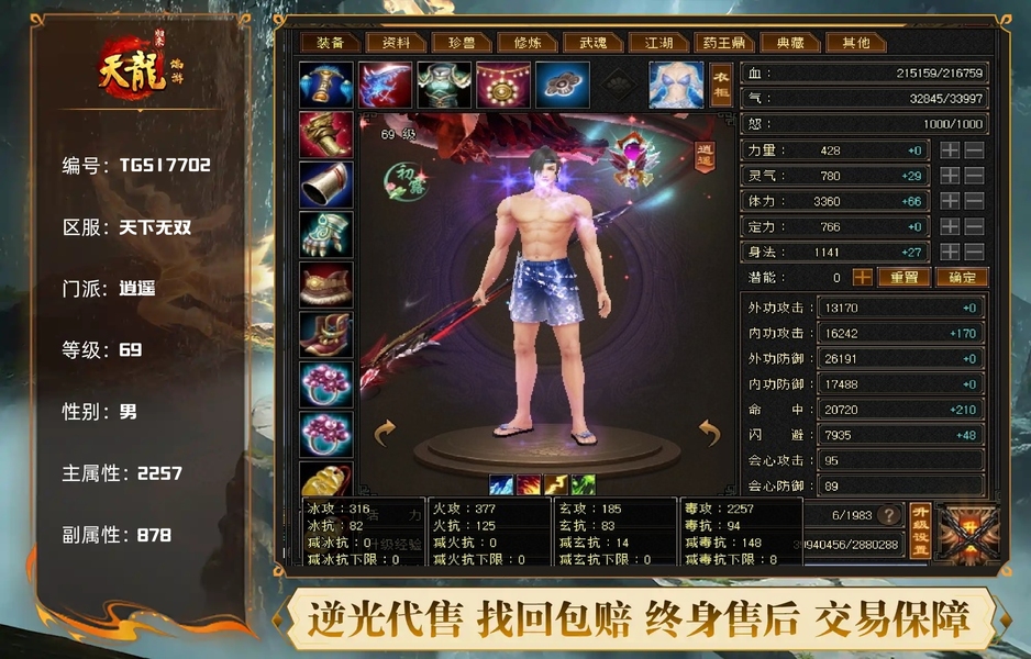 【TGS17702】 | 逍遥 | 等级:69 | 主属性:2257 | 副属性:878 | 男 | 主毒攻