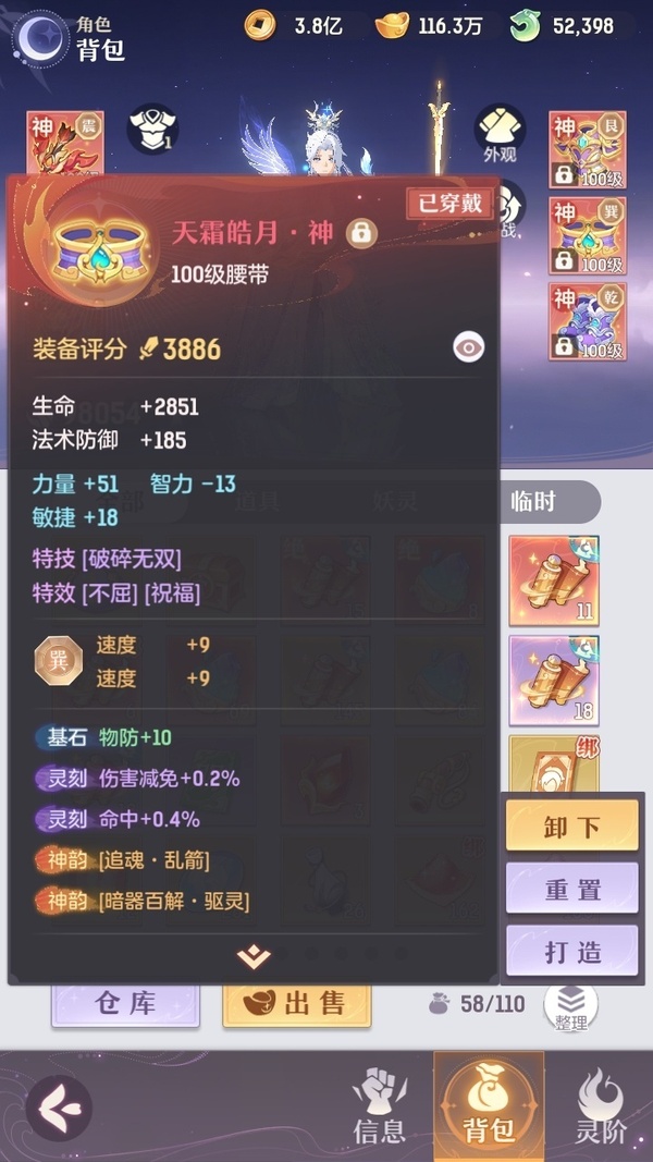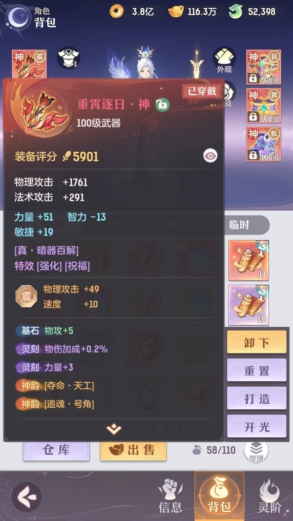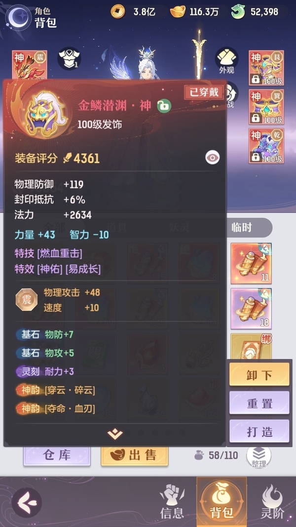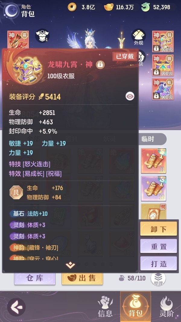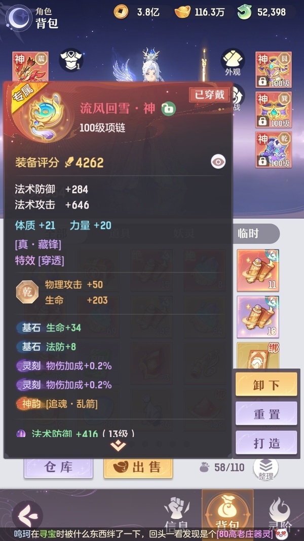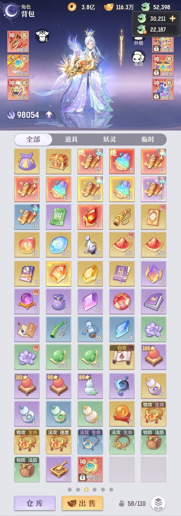 家说卖家自主行为,真实情况以游戏数据为准 凤凰游,全套典藏,12神韵毕业,所有装备都是买的毕业装,光武器15万玉,仓库资源一大堆。身上还有3万多活玉+2万2的绑玉,全是极品宝宝,装备也基本完全毕业了,基本满蓝字,评分9.8,灵宝还能提升1000多,绝灵宝多出来七八个没有合绝灵息。拿上号不用充一分钱,新区都快能养老了。真心没时间玩了,贱卖是肯定的,懂货的来