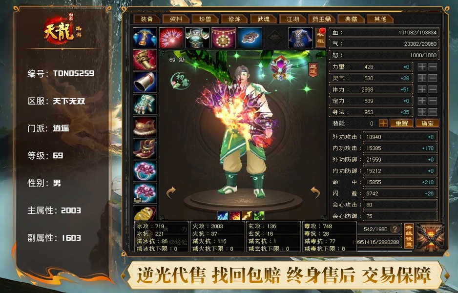 【TDN05259】 | 逍遥 | 等级:69 | 主属性:2003 | 副属性:1603 | 男 | 主火攻