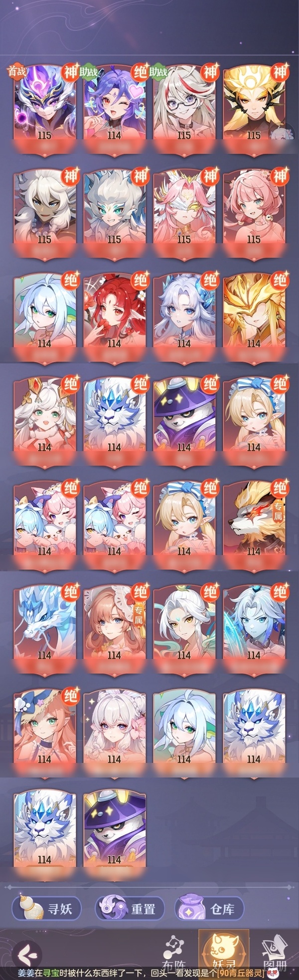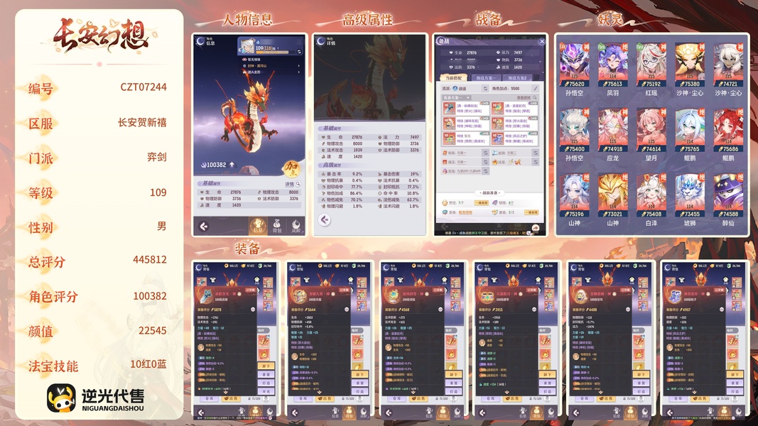 颜值:22545 | 等级:109 | 弈剑 | 神兽数:7 | 法宝颜色统计:10红0蓝 | 总评分:445812 | 角色评分:100382 | 妖灵评分:226425 | 灵师评分:119005 | 倾天三 | 淬金曜蚀,织梦星海,乘波踏浪,山君现,清寒羽冽,灵鸢一梦,墨染尘烟,星河揽月,离火苍龙,九春韶华,玉兔月赏,火树银花,哈?我当武器?,碎梦语情,炙烤大串 | 蝶恋芳菲,火神·赤曦 | 乌蹄·照夜,祥云,太一驴,吾皇·萌骑,钱多多,气球派对,灵华引,星昀渡,比翼同舆,万海真君,罗帷七香车,蕴灵天剑,浪起来,定乾坤·凌云,飞起来·壹号,负山海,北域霜枭,跃龙门,绵绵云,鸭与云游,喵小萌,飞龙在天,红莲·出尘,兔球,风火乾坤,大荒之主,海月璃梦,玄夜星羚,焚天火凤,花将军,招财进喵,初弦瑶桂,乘风入梦,狐心入梦,风驰电掣,踏火焚夜,凤蝶·梦浮生,柯冲冲 | 【买号找回永久包赔】