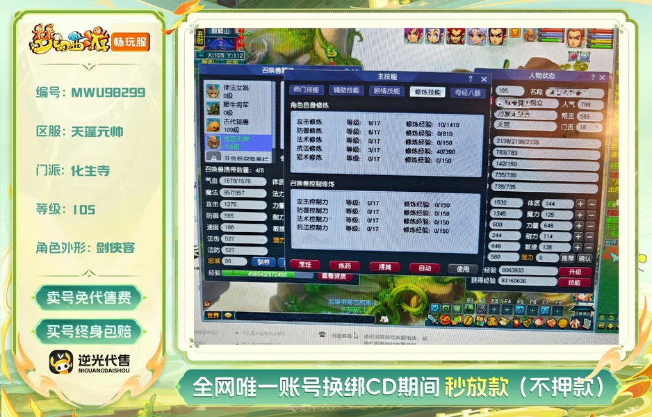 等级:105 | 五庄观,盘丝洞,魔王寨,化生寺,天宫 | 存在换绑CD | 180天尊享特权 | 男 | 【逆光代售卖号0手续费】【买号找回永久包赔】